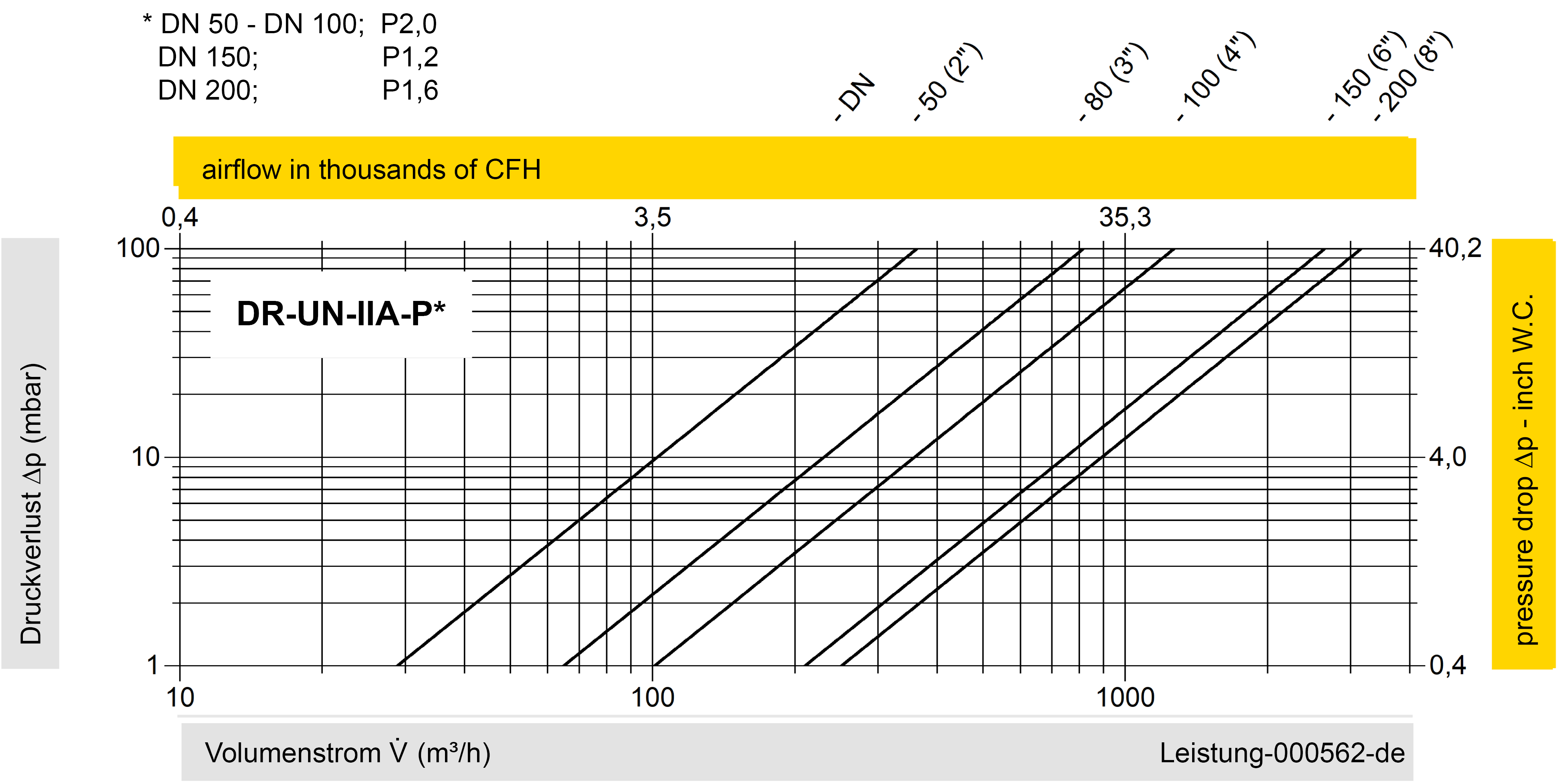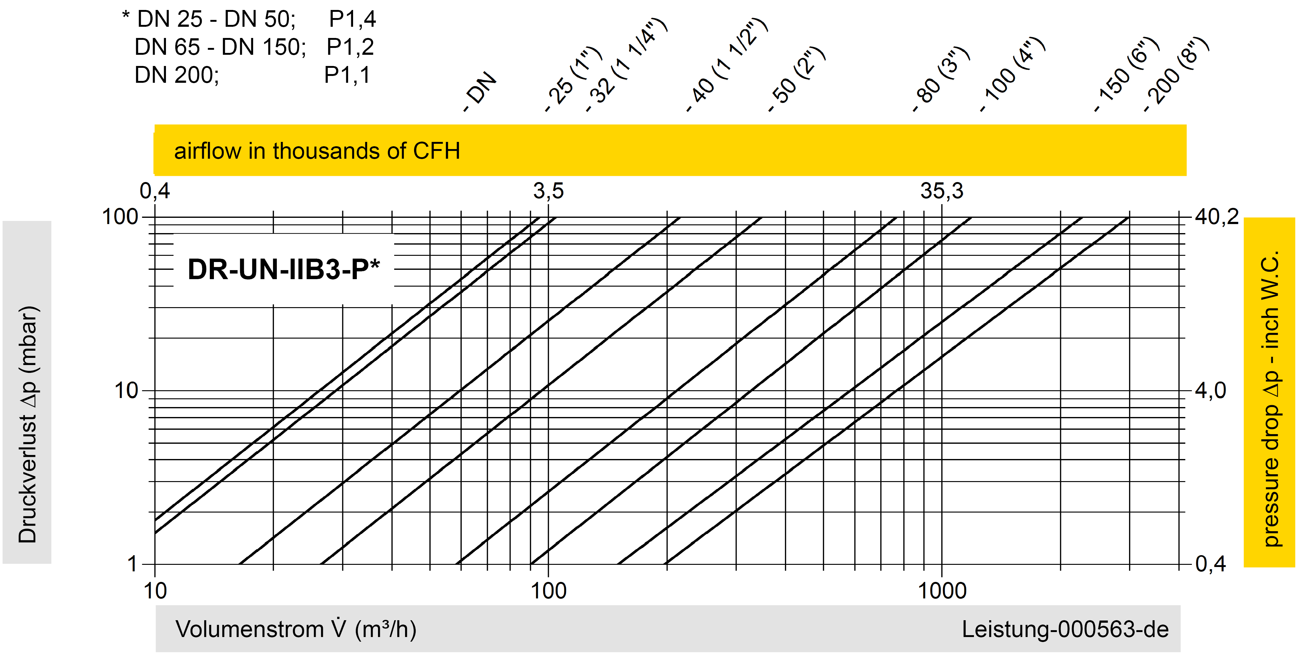 Diese Volumenstromdiagramme sind mit einer kalibrierten und TÜV-zertifizierten Strömungsmessanlage ermittelt worden. Der Volumenstrom V in m³/h bezieht sich auf den technischen Normzustand von Luft nach ISO 6358 (20°C, 1bar). Umrechnung auf andere Dichte und Temperatur siehe Kap. 1: Technische Grundlagen.