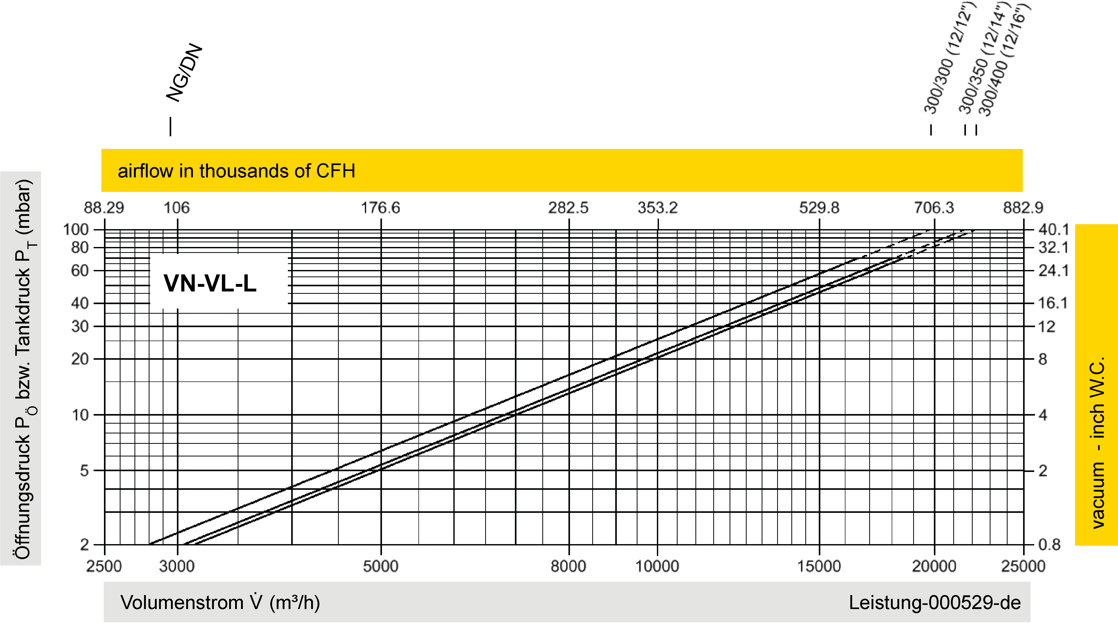 Diese Volumenstromdiagramme sind mit einer kalibrierten und TÜV-zertifizierten Strömungsmessanlage ermittelt worden. Der Volumenstrom V in m³/h bezieht sich auf den technischen Normzustand von Luft nach ISO 6358 (20°C, 1bar). Umrechnung auf andere Dichte und Temperatur siehe Kap. 1: Technische Grundlagen.