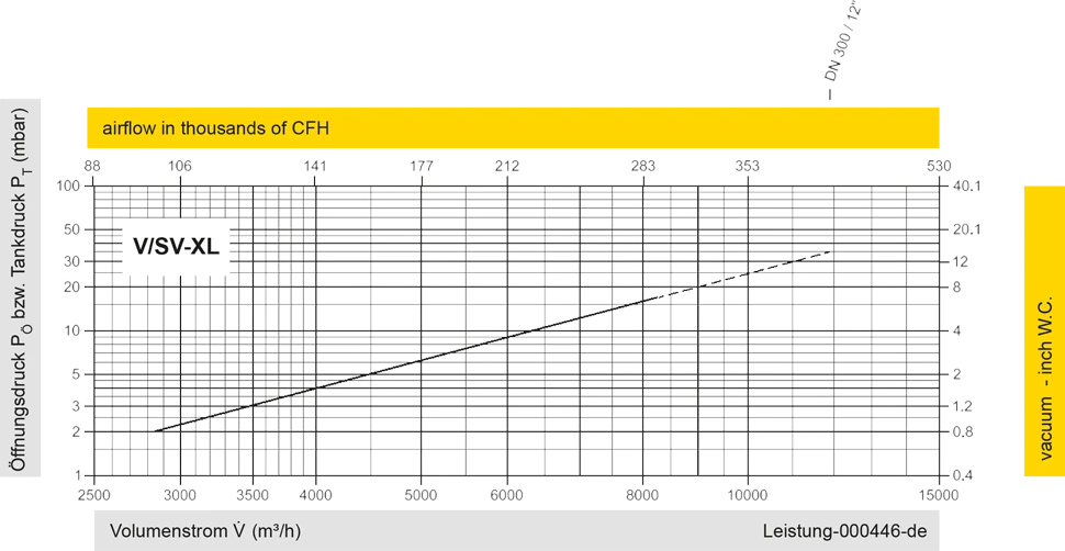 Die Ventilteller sind gewichtsbelastet. Höhere Ansprechdrücke werden auf Anfrage in Sonderausführung mit Federbelastung realisiert. Es stehen zwei Ausführungen zur Auswahl:Über- und Unterdruckventil in GrundausführungV/SV-XL - –