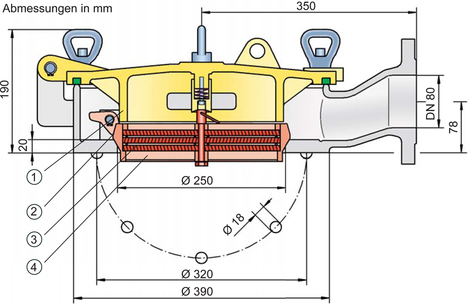 Die Armatur bietet unidirektionale Flammendurchschlagsicherheit. Im Wesentlichen besteht die Sicherung aus einem Stoßfang (1) und der PROTEGO® Flammensicherung (2). Mehrere FLAMMENFILTER® (3) und Zwischenlagen, die in einem FLAMMENFILTER® Käfig (4) stabil eingefasst sind, kennzeichnen die PROTEGO® Flammensicherung. Die PROTEGO® Flammensicherung ist beweglich gelagert und kann für Wartungszwecke zur Seite geklappt werden. Hauptziel dieser flexiblen Konstruktion ist, dass bei Eisbildung auf der PROTEGO® Flammensicherung bzw. bei kristallisierenden, den FLAMMENFILTER® zusetzenden Produkten eine Notent und -belüftung des Tankes erfolgen kann.