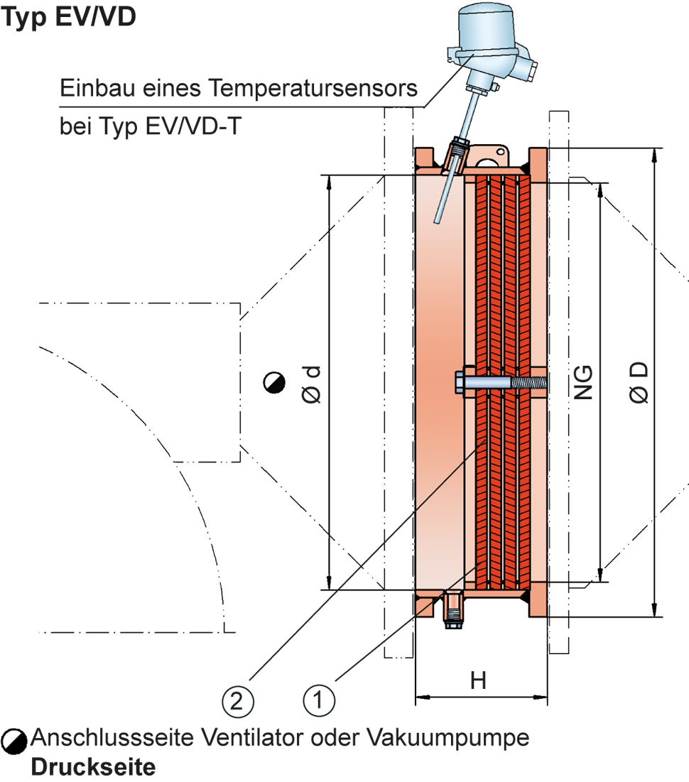 Flammensicherung für die Druckseite mit integriertem Temperatursensor* als zusätzliche Absicherung gegen kurzzeitiges Brennen von einer SeiteEV/VD- T