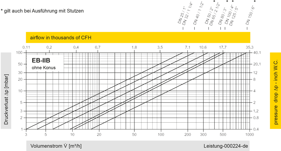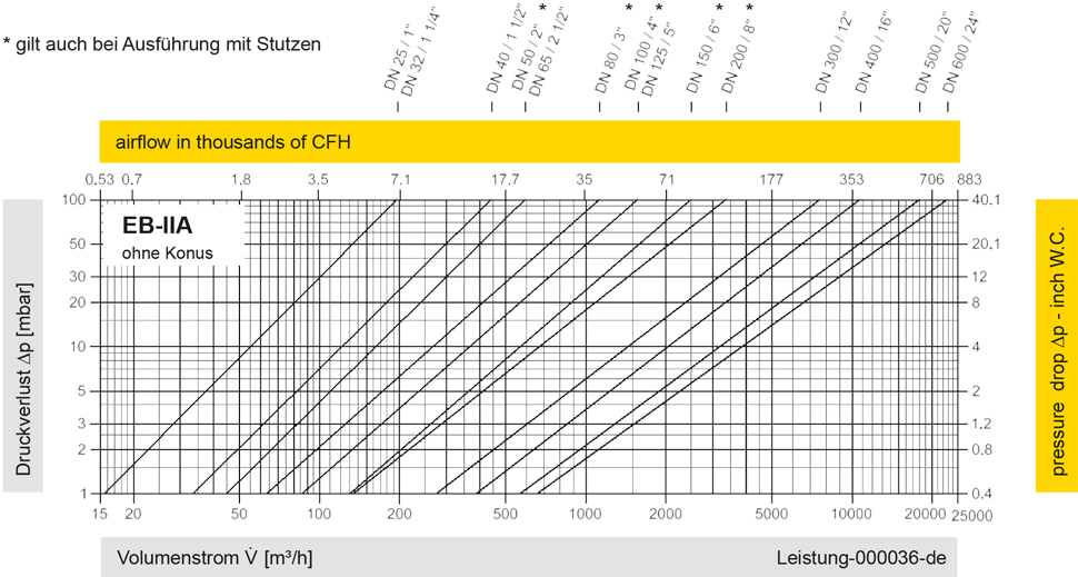 Hinweis: Volumenstromdiagramme für EB-DN/DN2-IIA/IIB mit Konus auf Anfrage