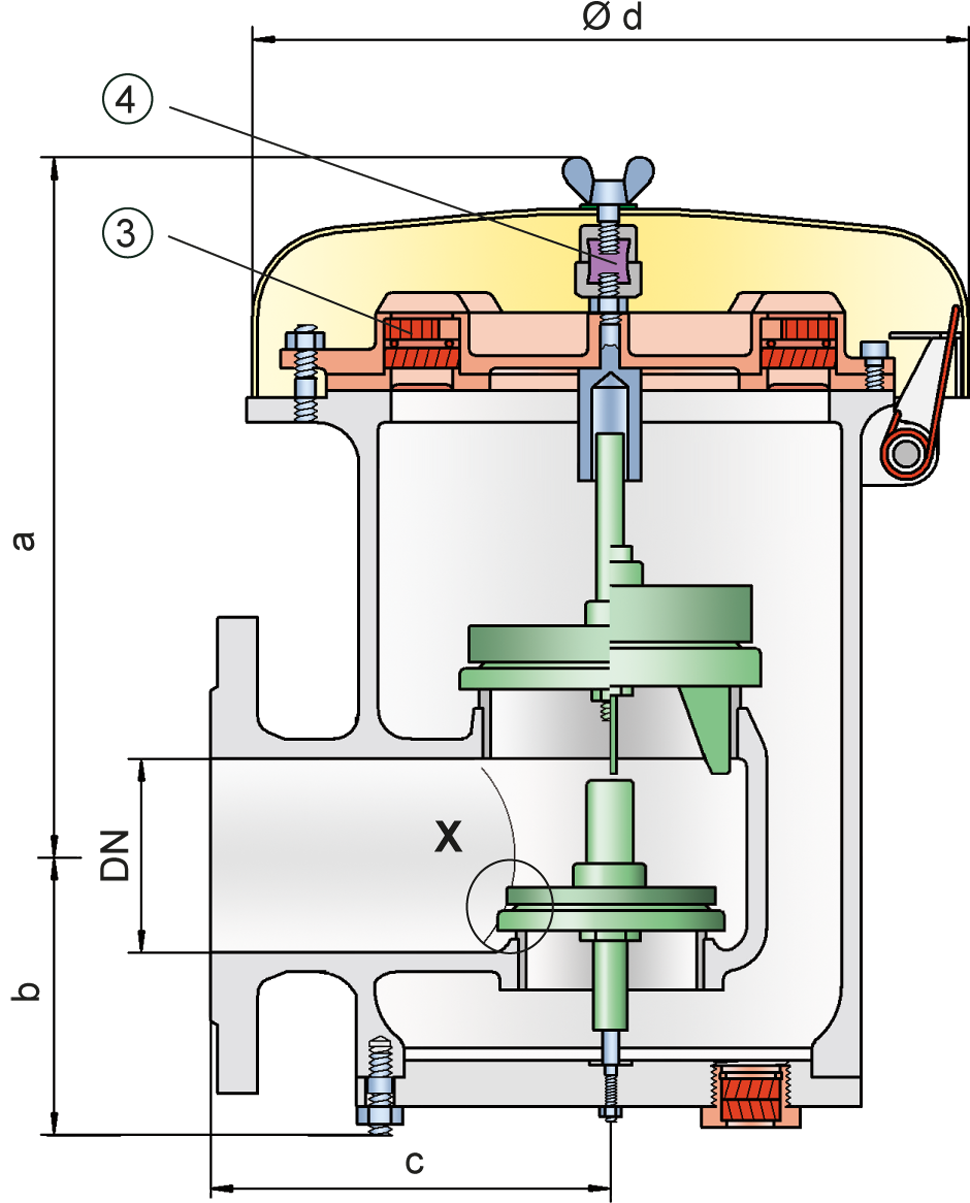Das Ventil ist in den Druckstufen für Überdruck und Unterdruck nahezu beliebig kombinierbar. Die Ventilteller sind gewichtsbelastet. Bei Überschreitung einer Differenz zwischen Druck und Vakuum von 150 mbar kommen Sonder-Ventilteller zum Einsatz.Es stehen zwei Ausführungen zur Auswahl: