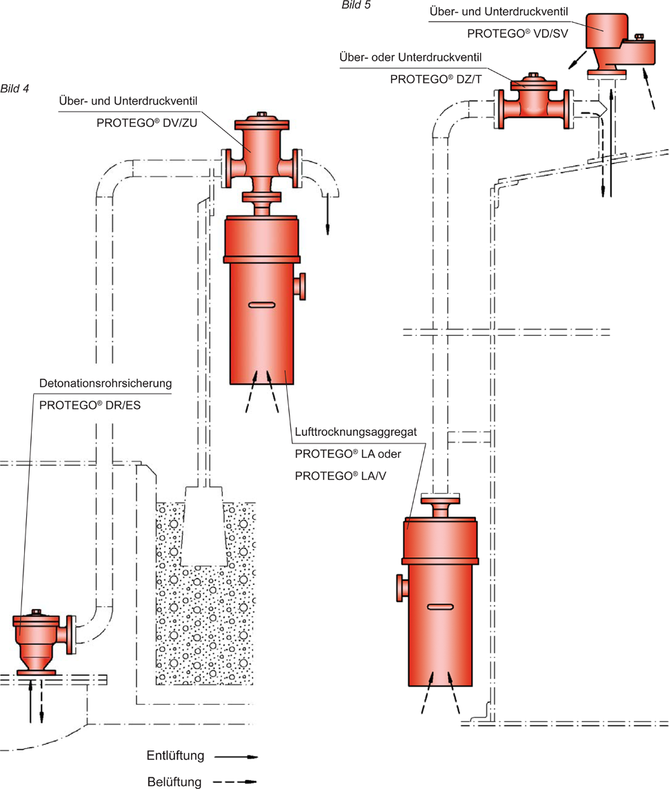 Wenn es sich bei dem Einlagerungsmedium um eine brennbare Flüssigkeit handelt, sind neben dem Lufttrocknungsaggregat sowie den Über- und Unterdruckventilen auch Flammendurchschlagsicherungen zu installieren. Je nach den vorliegenden Betriebsbedingungen ist auch die Kombination von anderen Ent- und Belüftungsventilen mit integriertem Lufttrocknungsaggregat möglich.