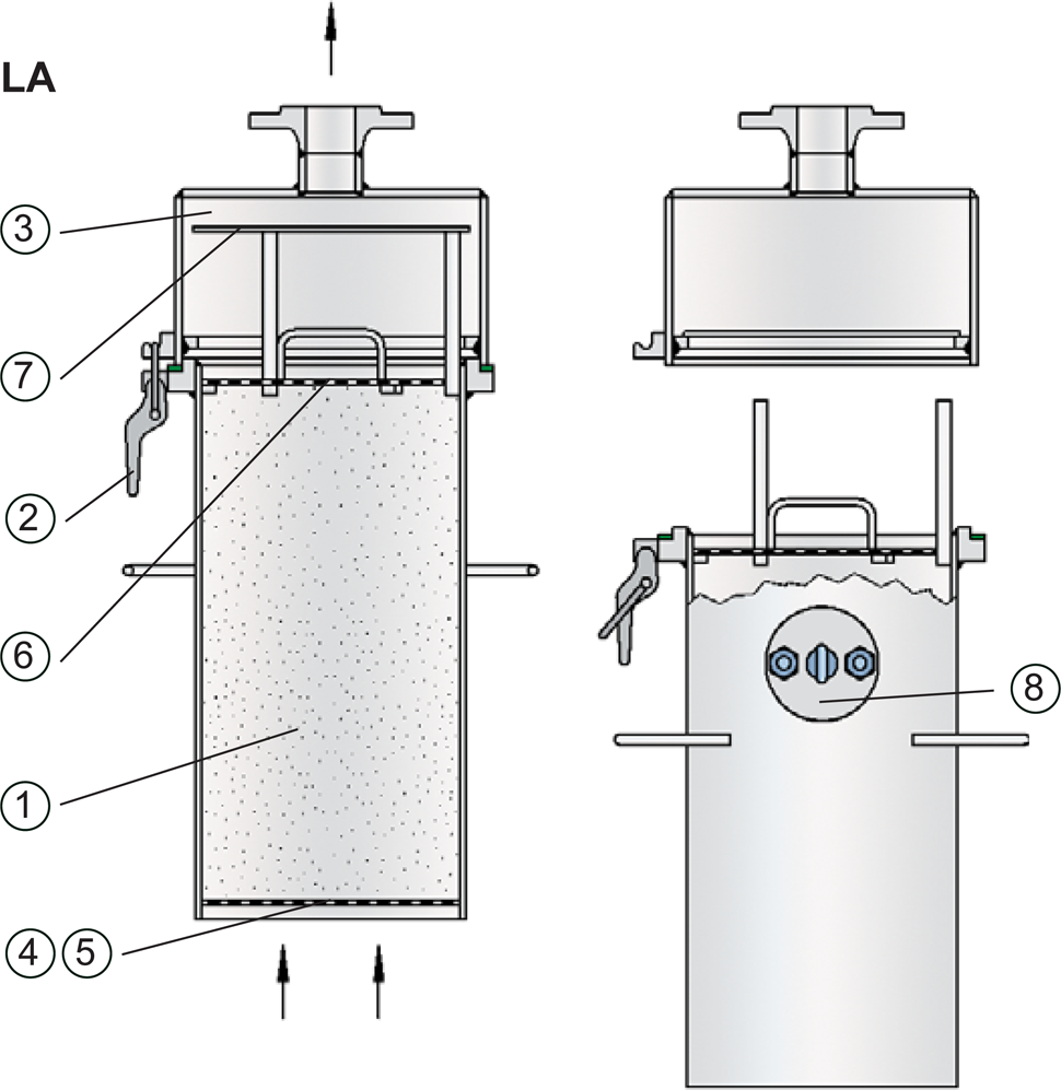 Das Einzelaggregat LA besteht im Wesentlichen aus dem Trockenmittelbehälter (1), der mit Schnellverschlusselementen (2) an den fest zu installierenden Anschlusskopf (3) mit Flanschanschluss nach DIN 2501 oder nach anderer internationaler Norm angeschlossen wird. Der Siebboden (4) mit dem Schutzsieb (5) ist im Trockenmittelbehälter (1) fest eingeschweißt. Der obere Siebdeckel (6) ist lose eingelegt, so dass dieser in einfacher Weise entfernt und das Trockenmittel eingegeben bzw. herausgenommen werden kann. Im Anschlusskopf (3) befindet sich die Verschlussplatte (7), die bei Abnahme des Behälters die Öffnung des Anschlusskopfes abschließt, damit während der Zeit des Auswechselns des Behälters keine ungetrocknete Luft angesaugt werden kann.