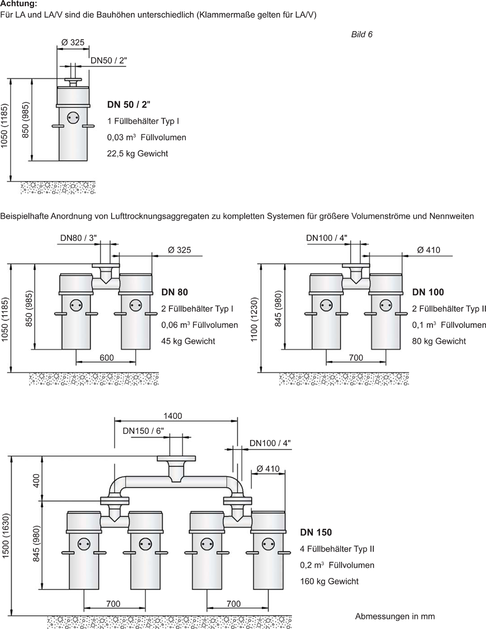In Bild 6 sind die Kombinationsmöglichkeiten der Lufttrocknungsaggregate PROTEGO® LA und LA/V zu kompletten Einheiten dargestellt. Diesem Blatt können wiederum auch die Baumaße sowie die Füllvolumen bzw. Füllgewichte entnommen werden.
