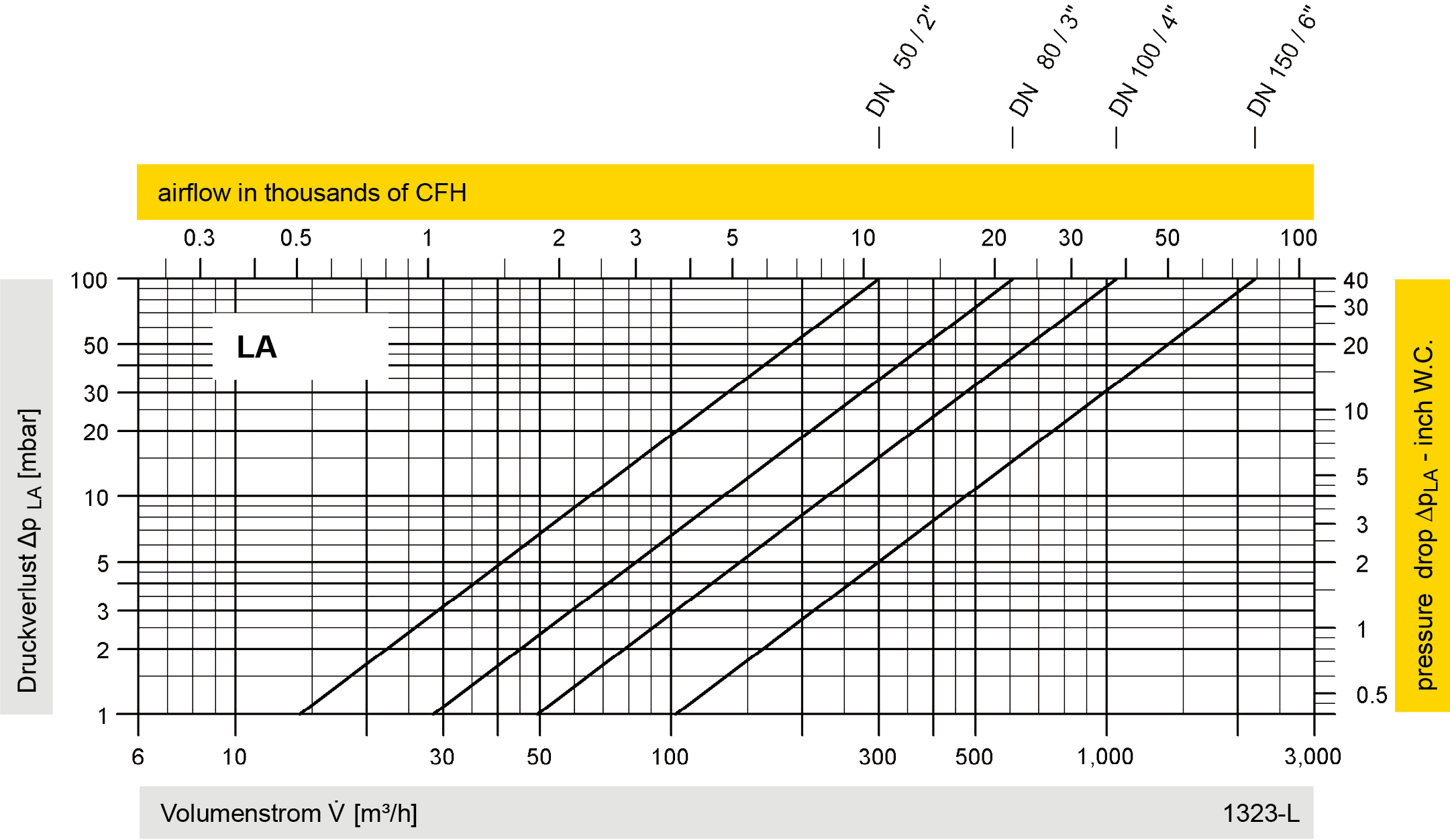 Die Leistungsangaben gelten für das Einzelaggregat PROTEGO® LA und beziehen sich auf KC®-Trockenperlenfüllgut von 2 bis 5 mm Durchmesser. Bei dem Typ PROTEGO® LA/V ergibt sich der Gesamtdruckverlust ∆pLA/V aus dem Differenzdruck ∆pLA zuzüglich dem Einstelldruck des Rückschlagventils pVR.