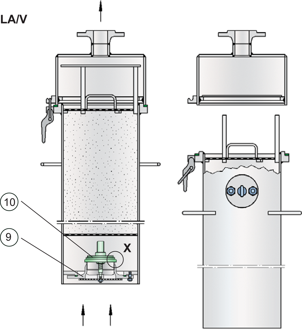 Das Lufttrocknungsaggregat Typ LA/V entspricht im Wesentlichen dem Typ LA mit zusätzlich in die Ansaugöffnung integriertem auswechselbarem Unterdruckventil (9) mit Schutzsieb und Ventilteller (10). Wenn nicht über das Lufttrocknungsaggregat angesaugt wird, ist das Gerät zur Atmosphäre hin abgeschlossen und dicht. Damit kann sich das Trockenmittel bei hoher Luftfeuchtigkeit nicht im unteren Bereich des Trockenmittelbehälters beladen.
