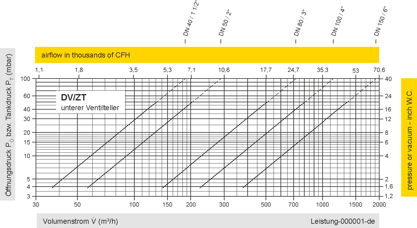 Die Ventilteller sind gewichtsbelastet. Höhere Ansprechdrücke werden auf der Überdruckseite mit Federbelastung realisiert (Typ DV/ZT-F).Es stehen zwei Ausführungen zur Auswahl: