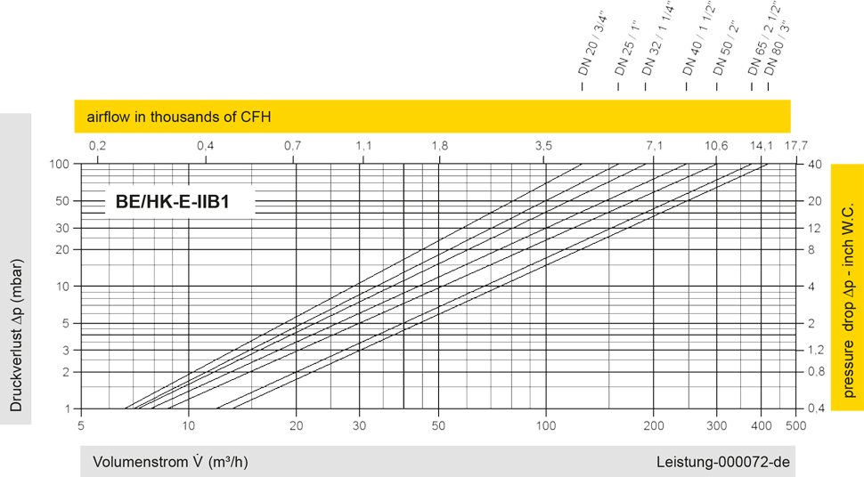 Diese Volumenstromdiagramme sind mit einer kalibrierten und TÜV-zertifizierten Strömungsmessanlage ermittelt worden. Der Volumenstrom V in m³/h bezieht sich auf den technischen Normzustand von Luft nach ISO 6358 (20°C, 1bar). Umrechnung auf andere Dichte und Temperatur siehe Kap. 1: Technische Grundlagen.