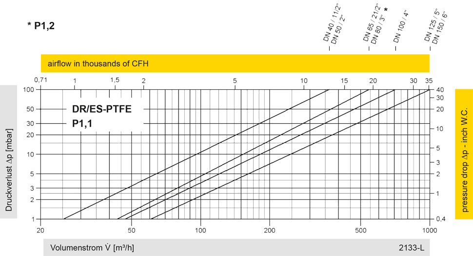 Diese Volumenstromdiagramme sind mit einer kalibrierten und TÜV-zertifizierten Strömungsmessanlage ermittelt worden. Der Volumenstrom V in m³/h bezieht sich auf den technischen Normzustand von Luft nach ISO 6358 (20°C, 1bar). Umrechnung auf andere Dichte und Temperatur siehe Kap. 1: Technische Grundlagen.