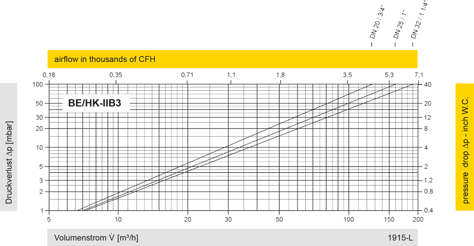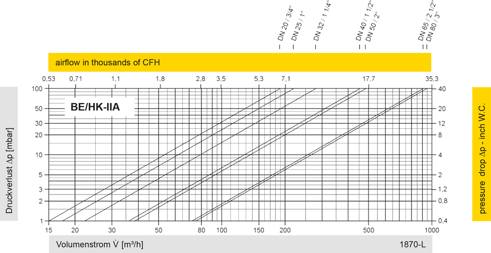 Diese Volumenstromdiagramme sind mit einer kalibrierten und TÜV-zertifizierten Strömungsmessanlage ermittelt worden. Der Volumenstrom V in m³/h bezieht sich auf den technischen Normzustand von Luft nach ISO 6358 (20°C, 1bar). Umrechnung auf andere Dichte und Temperatur siehe Kap. 1: Technische Grundlagen.