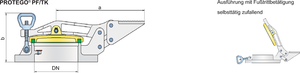 Bei der Ausführung mit Fußtrittbedienung PROTEGO® PF/TK wird das Peilstutzenpedal mit dem Gehäuse und dem Bügel verbunden.