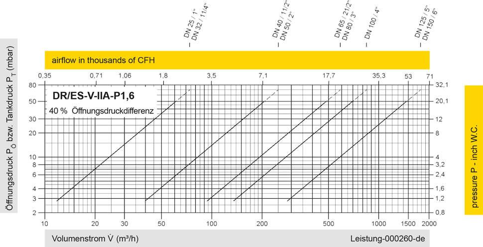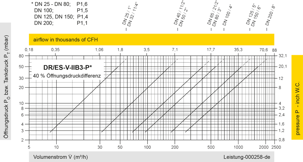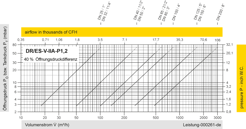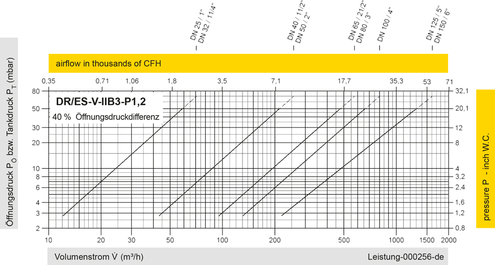 Diese Volumenstromdiagramme sind mit einer kalibrierten und TÜV-zertifizierten Strömungsmessanlage ermittelt worden. Der Volumenstrom V in m³/h bezieht sich auf den technischen Normzustand von Luft nach ISO 6358 (20°C, 1bar). Umrechnung auf andere Dichte und Temperatur siehe Kap. 1: Technische Grundlagen.