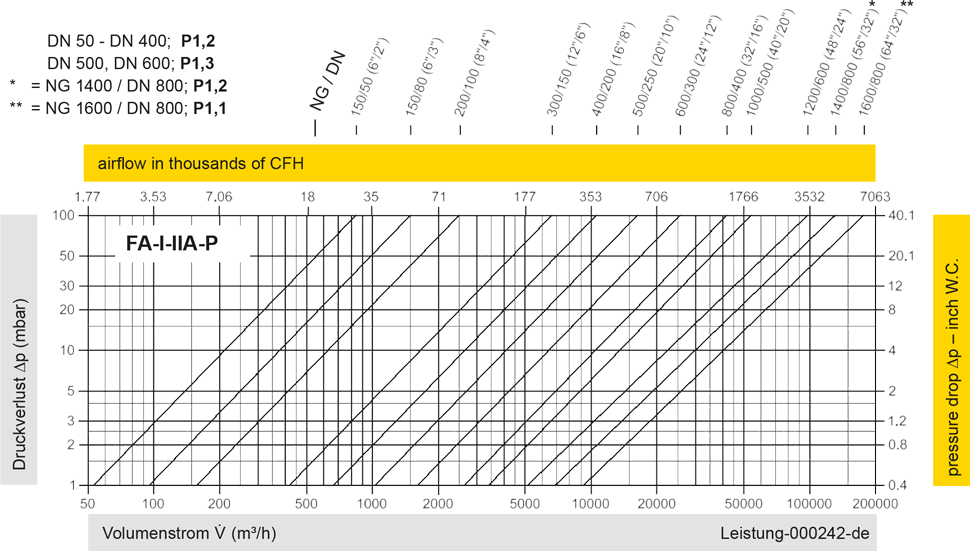 Diese Volumenstromdiagramme sind mit einer kalibrierten und TÜV-zertifizierten Strömungsmessanlage ermittelt worden. Der Volumenstrom V in m³/h bezieht sich auf den technischen Normzustand von Luft nach ISO 6358 (20°C, 1bar). Umrechnung auf andere Dichte und Temperatur siehe Kap. 1: Technische Grundlagen.