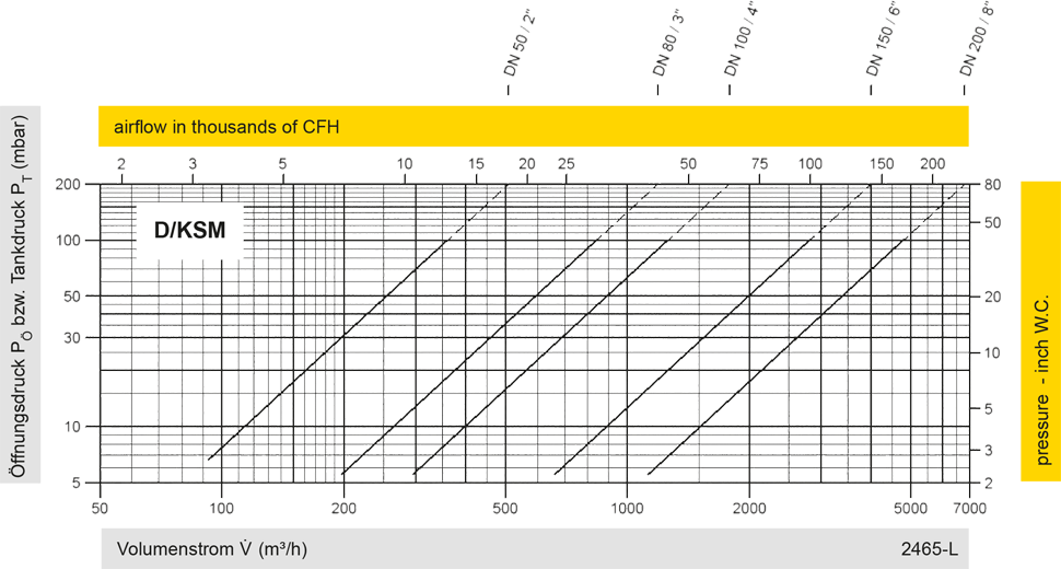 Diese Volumenstromdiagramme sind mit einer kalibrierten und TÜV-zertifizierten Strömungsmessanlage ermittelt worden. Der Volumenstrom V in m³/h bezieht sich auf den technischen Normzustand von Luft nach ISO 6358 (20°C, 1bar). Umrechnung auf andere Dichte und Temperatur siehe Kap. 1: Technische Grundlagen.