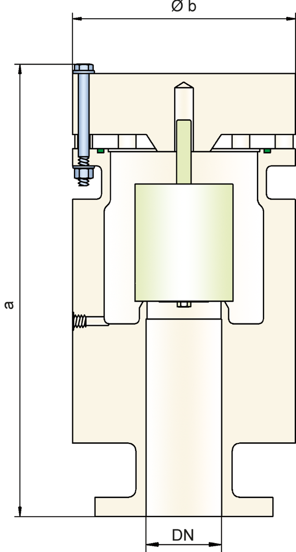 Der Ventilteller ist gewichtsbelastet, wobei die höchste Druckstufe nur mit metallischen Tellern erreicht wird.Überdruckventil in GrundausführungD/KSM-