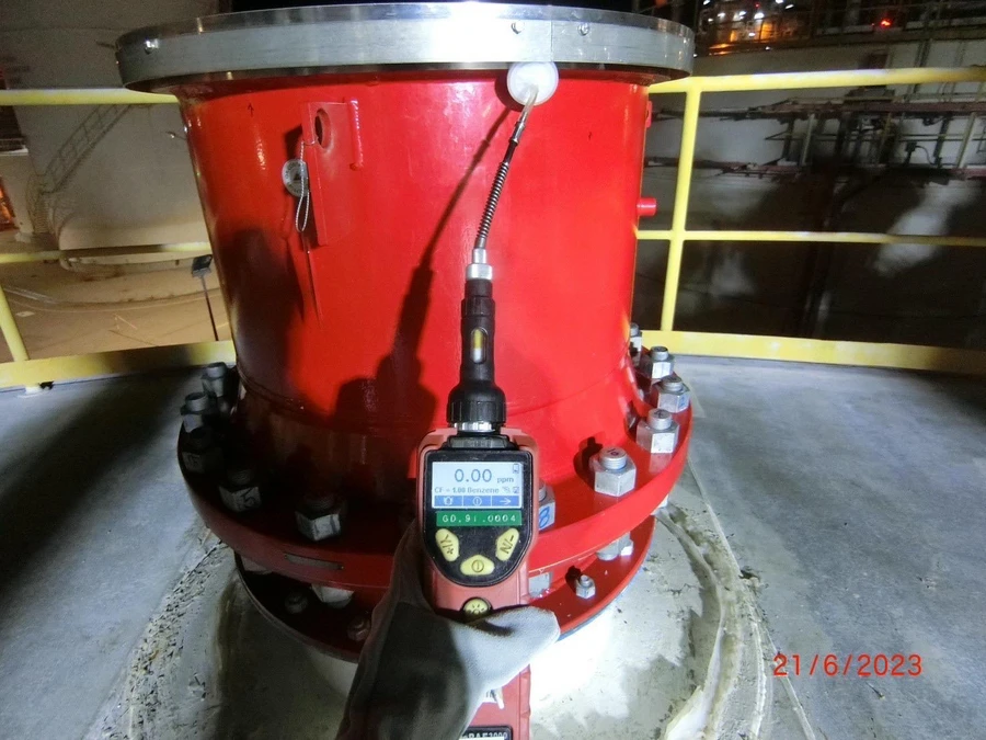The upgrade included the installation of PROTEGO® ER/V, V/SV, and PM-HF series valves sized to the tank’s low-pressure duty. After installation, the site’s engineering team conducted a field verification using calibrated gas detectors positioned on top of the tank roof.