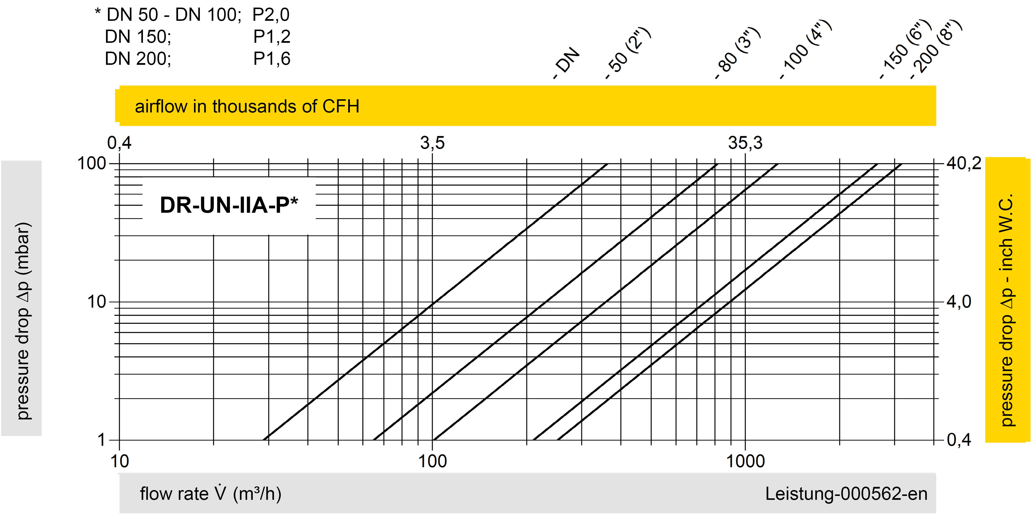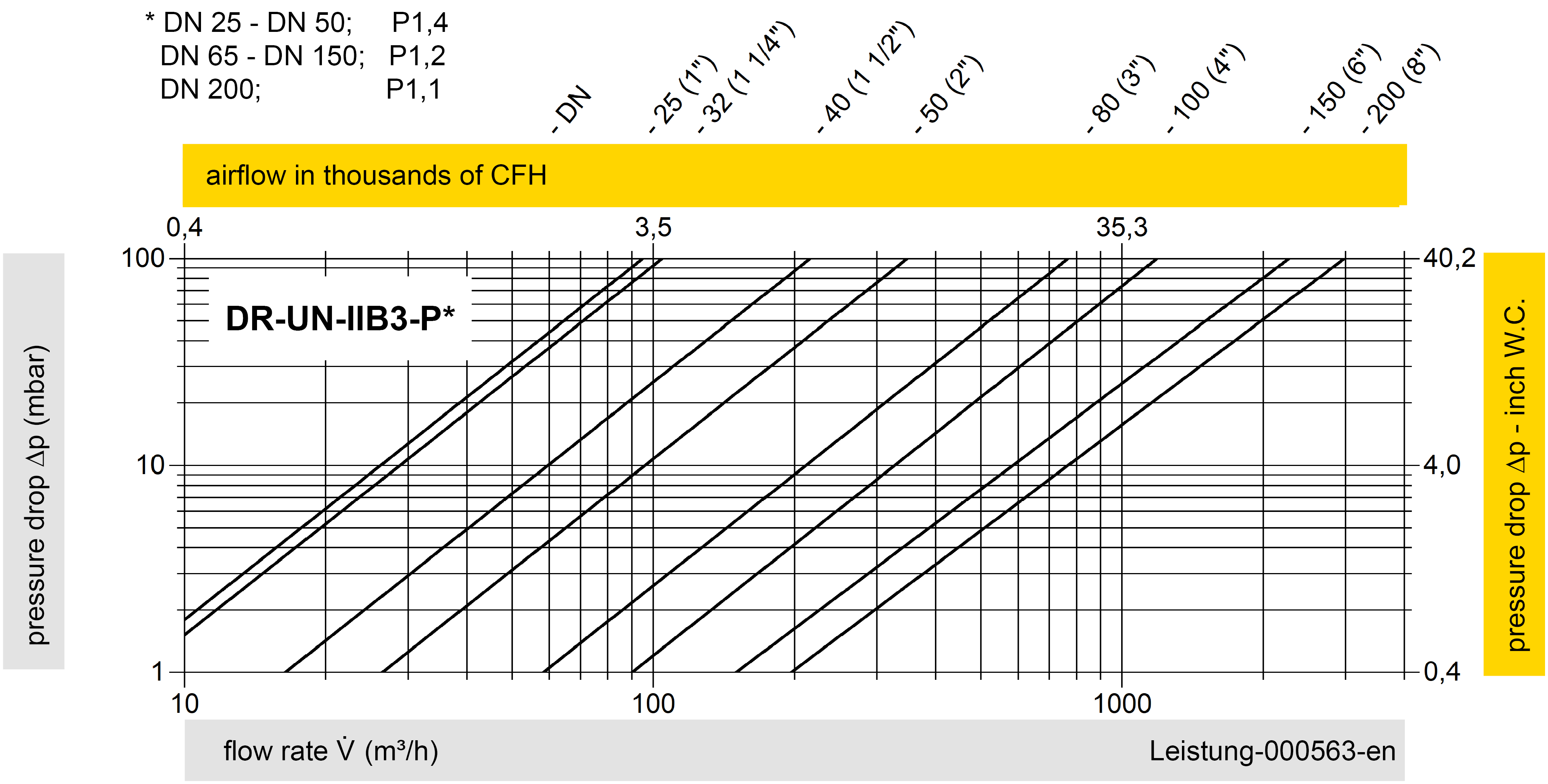 The flow capacity charts have been determined with a calibrated and TÜV certified flow capacity test rig. Volume flow V in (m³/h) and CFH refer to the standard reference conditions of air ISO 6358 (20°C, 1bar). For conversion to other densities and temperatures refer to Sec. 1: “Technical Fundamentals”.