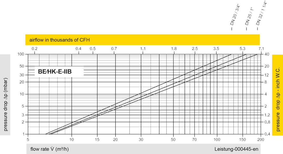 The flow capacity charts have been determined with a calibrated and TÜV certified flow capacity test rig. Volume flow V in (m³/h) and CFH refer to the standard reference conditions of air ISO 6358 (20°C, 1bar). For conversion to other densities and temperatures refer to Sec. 1: “Technical Fundamentals”.