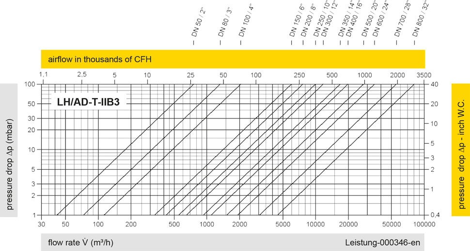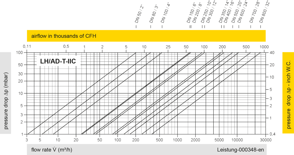 The flow capacity charts have been determined with a calibrated and TÜV certified flow capacity test rig. Volume flow V in (m³/h) and CFH refer to the standard reference conditions of air ISO 6358 (20°C, 1bar). For conversion to other densities and temperatures refer to Sec. 1: “Technical Fundamentals”.