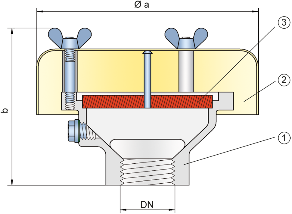 (1), a weather hood (2), and the PROTEGO® flame arrester unit (3). The device is equipped with a metal weather hood. The FLAMEFILTER® gap size will depend on the device’s intended use.
