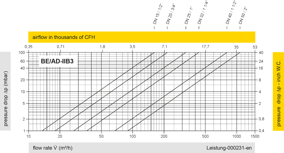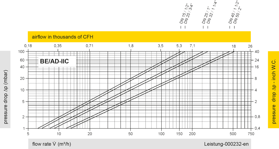 The flow capacity charts have been determined with a calibrated and TÜV certified flow capacity test rig. Volume flow V in (m³/h) and CFH refer to the standard reference conditions of air ISO 6358 (20°C, 1bar). For conversion to other densities and temperatures refer to Sec. 1: “Technical Fundamentals”.