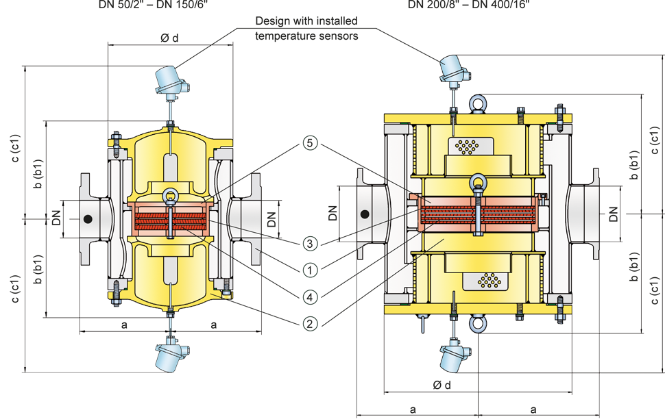 * for devices exposed to elevated temperatures above 150°C / 302 °F (T150), gaskets made of PTFE. Special device with unidirectional shock absorber DR/SW-... from DN 50 resp. NG 150 available.