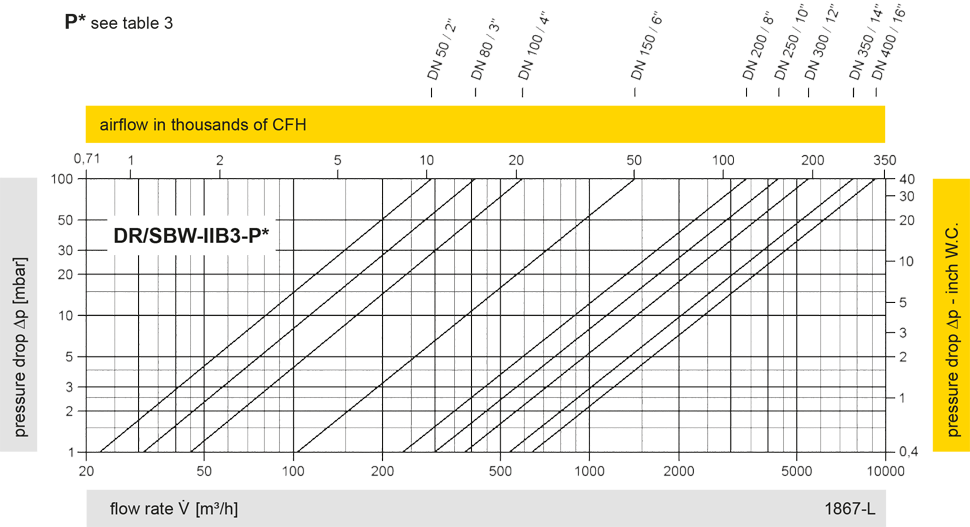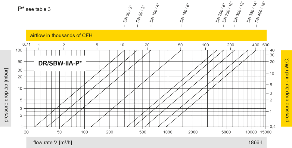The flow capacity charts have been determined with a calibrated and TÜV certified flow capacity test rig. Volume flow V in (m³/h) and CFH refer to the standard reference conditions of air ISO 6358 (20°C, 1bar). For conversion to other densities and temperatures refer to Sec. 1: “Technical Fundamentals”.