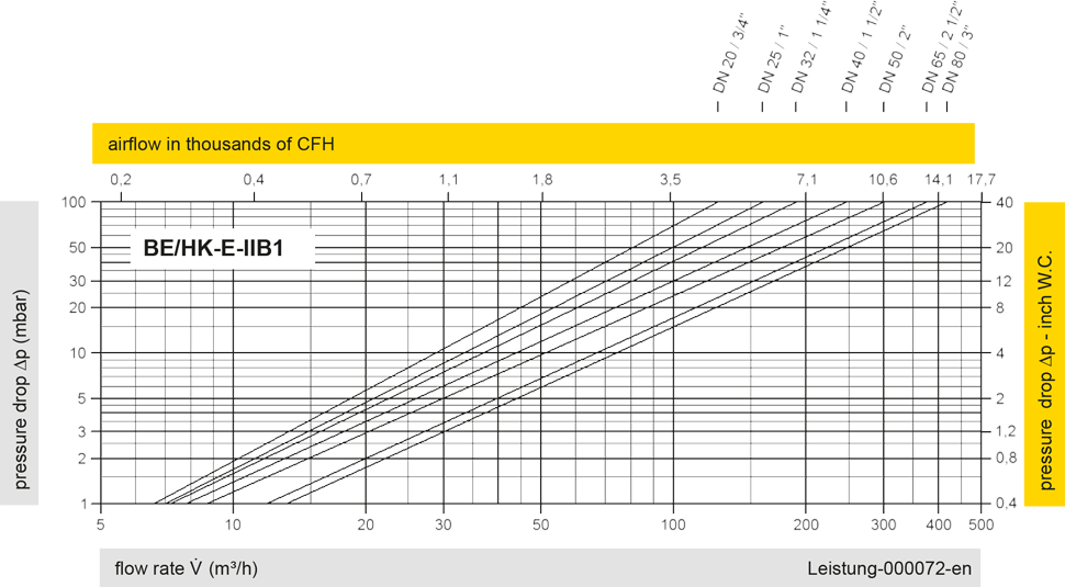 The flow capacity charts have been determined with a calibrated and TÜV certified flow capacity test rig. Volume flow V in (m³/h) and CFH refer to the standard reference conditions of air ISO 6358 (20°C, 1bar). For conversion to other densities and temperatures refer to Sec. 1: “Technical Fundamentals”.