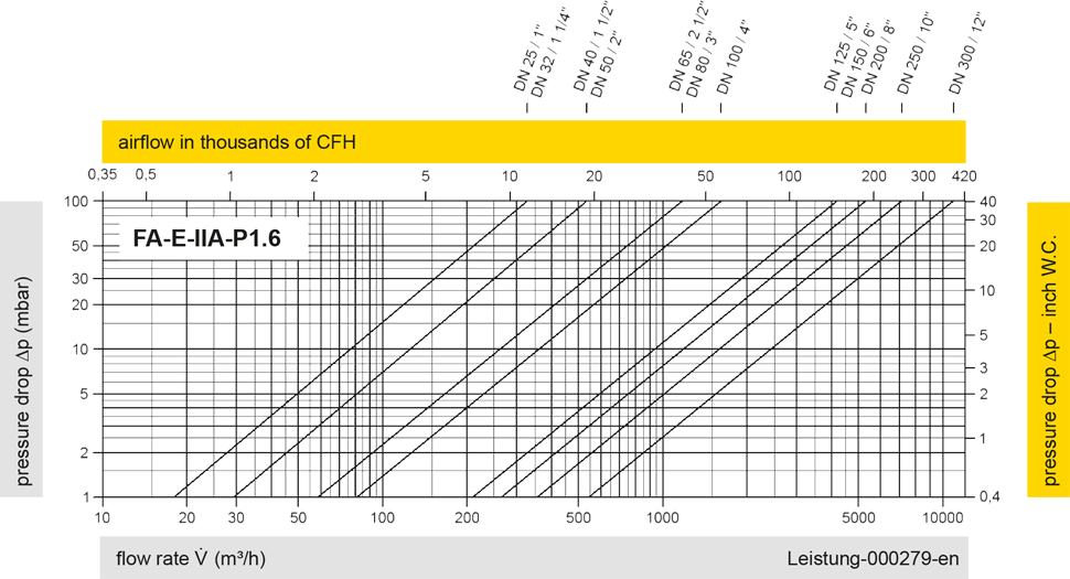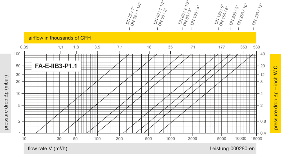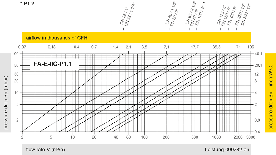 The flow capacity charts have been determined with a calibrated and TÜV certified flow capacity test rig. Volume flow V in (m³/h) and CFH refer to the standard reference conditions of air ISO 6358 (20°C, 1bar). For conversion to other densities and temperatures refer to Sec. 1: “Technical Fundamentals”.