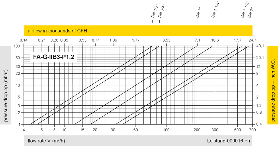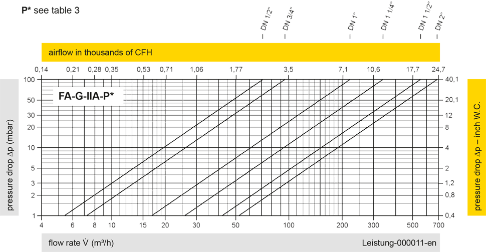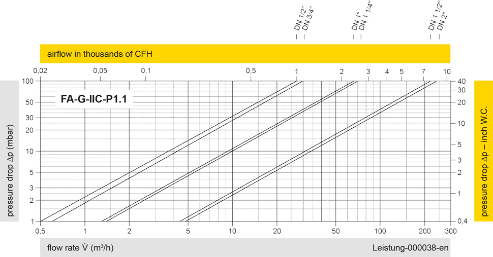 The flow capacity charts have been determined with a calibrated and TÜV certified flow capacity test rig. Volume flow V in (m³/h) and CFH refer to the standard reference conditions of air ISO 6358 (20°C, 1bar). For conversion to other densities and temperatures refer to Sec. 1: “Technical Fundamentals”.