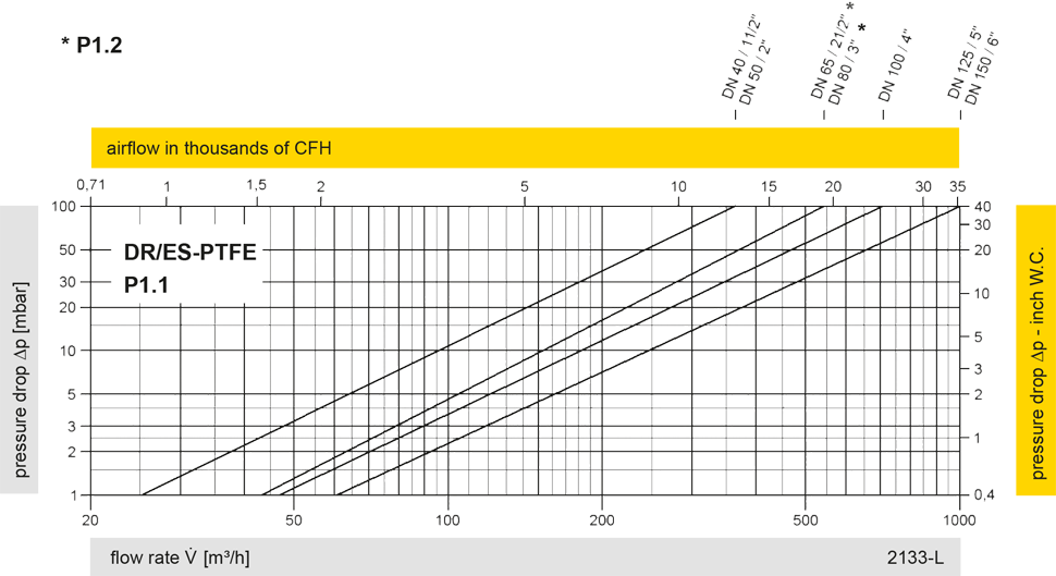 The flow capacity charts have been determined with a calibrated and TÜV certified flow capacity test rig. Volume flow V in (m³/h) and CFH refer to the standard reference conditions of air ISO 6358 (20°C, 1bar). For conversion to other densities and temperatures refer to Sec. 1: “Technical Fundamentals”.