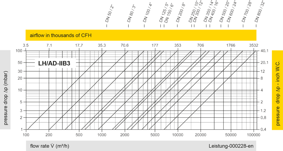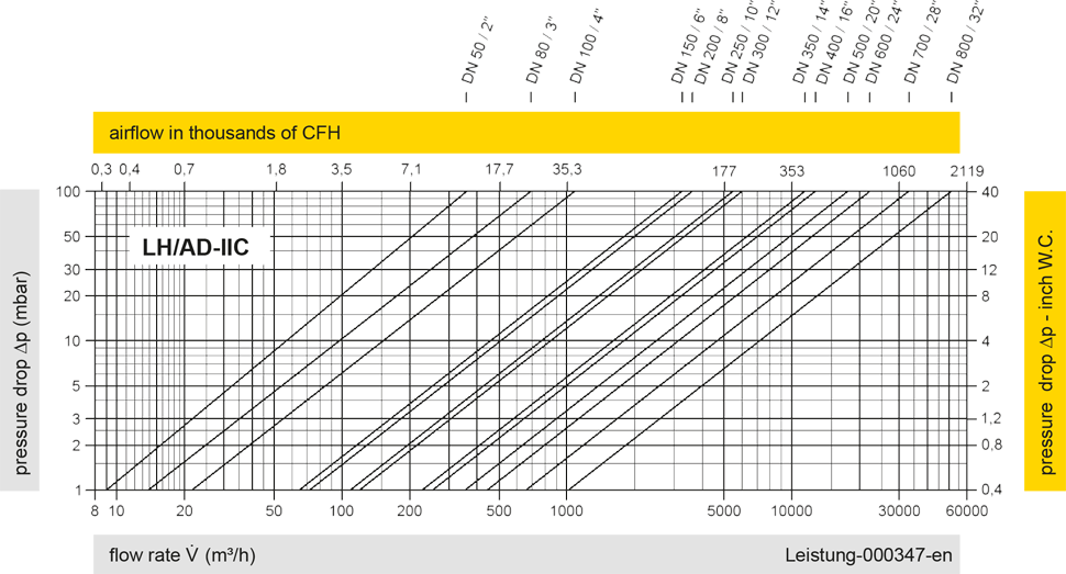 The flow capacity charts have been determined with a calibrated and TÜV certified flow capacity test rig. Volume flow V in (m³/h) and CFH refer to the standard reference conditions of air ISO 6358 (20°C, 1bar). For conversion to other densities and temperatures refer to Sec. 1: “Technical Fundamentals”.