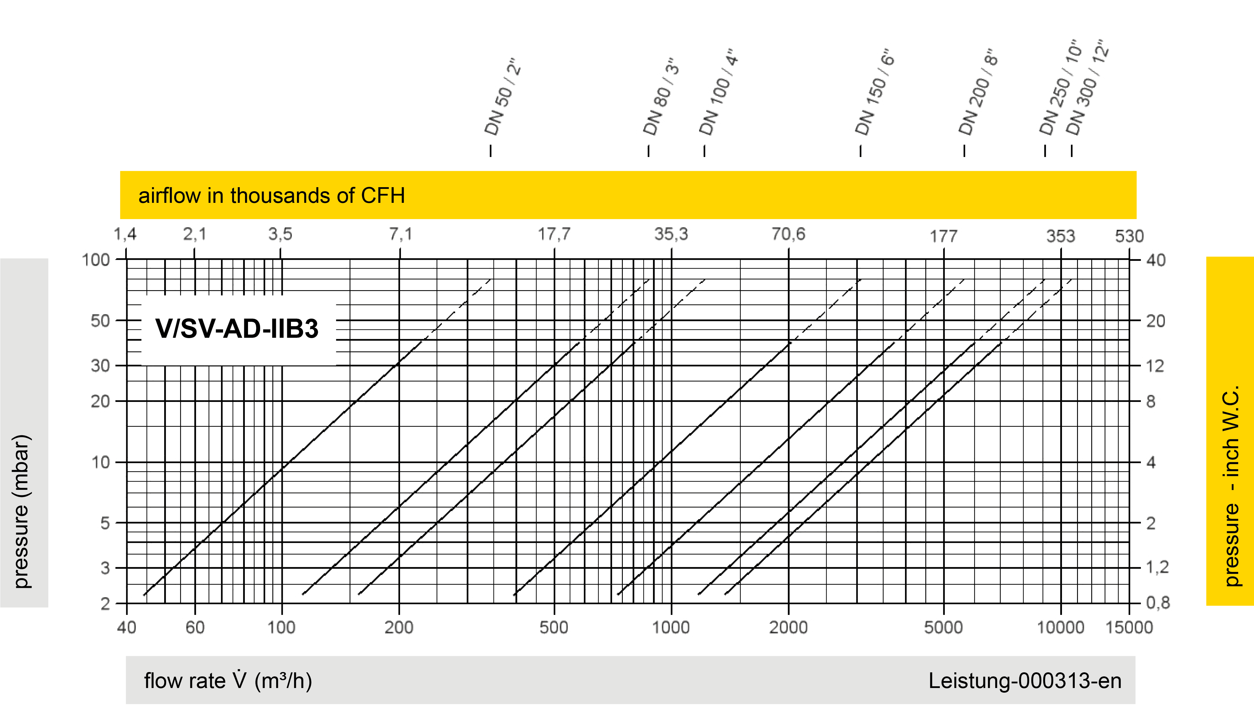 The flow capacity charts have been determined with a calibrated and TÜV certified flow capacity test rig. Volume flow V in (m³/h) and CFH refer to the standard reference conditions of air ISO 6358 (20°C, 1bar). For conversion to other densities and temperatures refer to Sec. 1: “Technical Fundamentals”.