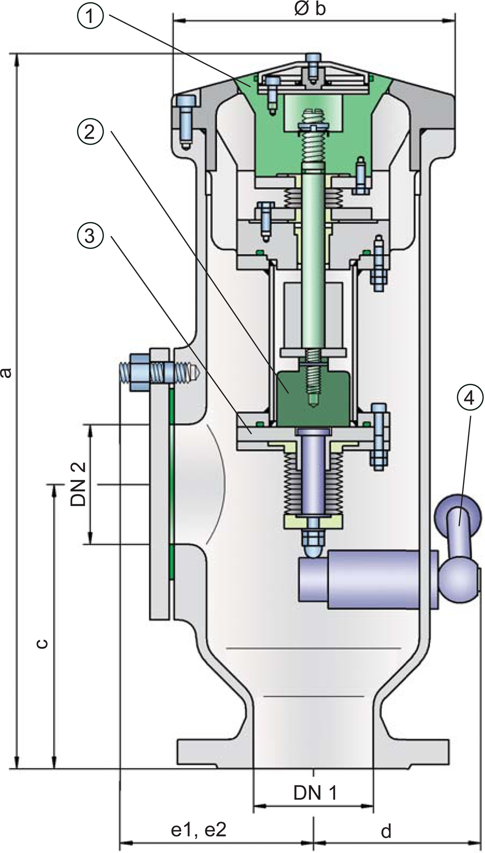 produces a vertical, free jet that transports the gases far away from the discharge opening. This keeps the deck free of gas. The shape of the valve cone and valve seat promotes the drainage of rainwater when closed. A function check of the valve is easily performed with a manual lift gear (4) which returns to ist initial position after actuation. A lateral flange connection, DN2, is standard for a
