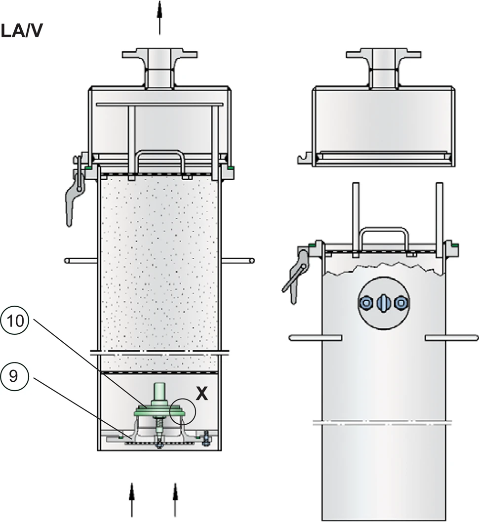 with air cushion sealing (figure 2) is used as valve pallet sealing up to pressure range II. From pressure range III, a lapped metallic sealing is used (figure 3). Air-drying devices of types LA or LA/V may be integrated into complete tank venting systems (see figures 4 and 5).