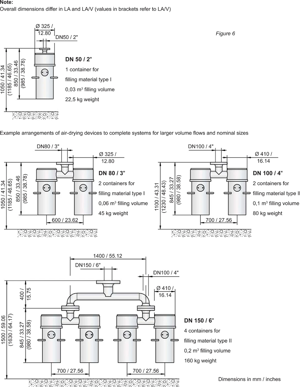 Figure 6 shows the combination options of PROTEGO® LA/V air-drying device in complete units. The overall dimensions, filling volumes and filling weights are also given in this figure.