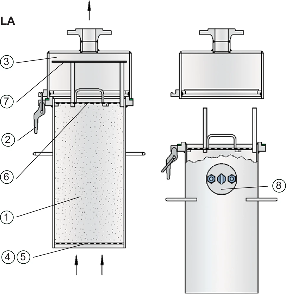 The single device PROTEGO® LA mainly consists of the drying agent container (1). Its snap closing elements (2) connect it to the connection head (3) with flange connection according to DIN 2501 or to any other international standard.