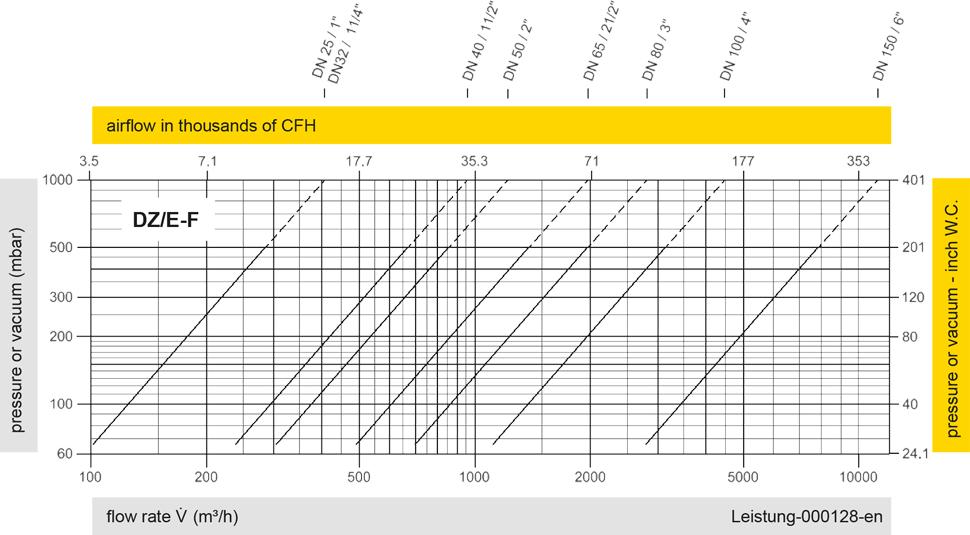 The flow capacity charts have been determined with a calibrated and TÜV certified flow capacity test rig. Volume flow V in (m³/h) and CFH refer to the standard reference conditions of air ISO 6358 (20°C, 1bar). For conversion to other densities and temperatures refer to Sec. 1: “Technical Fundamentals”.