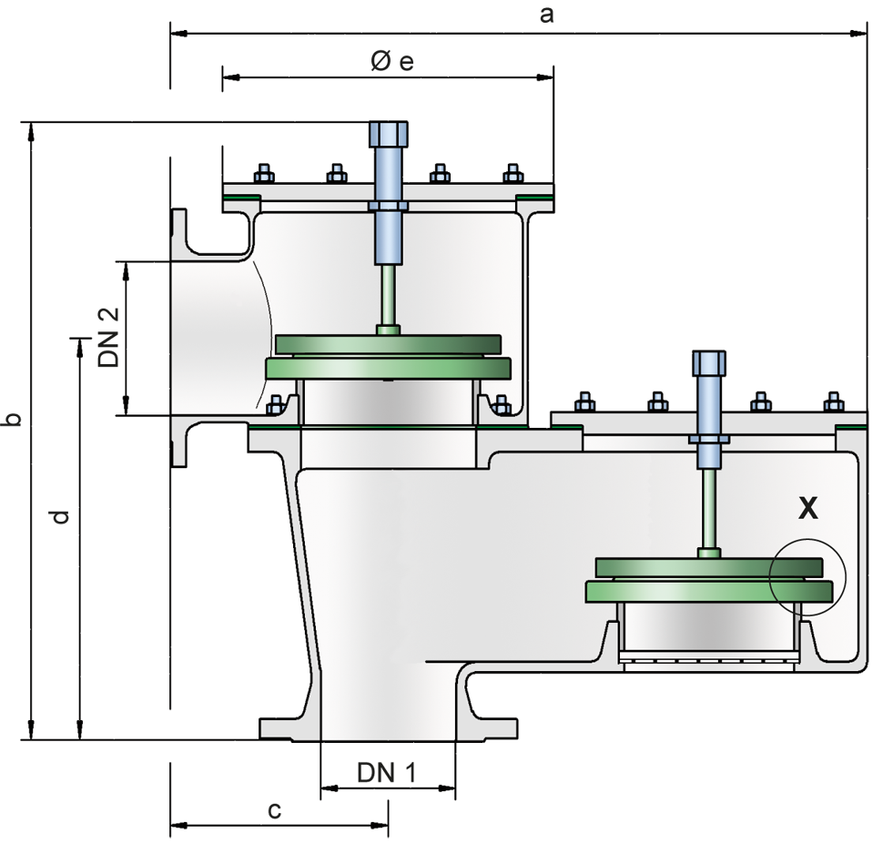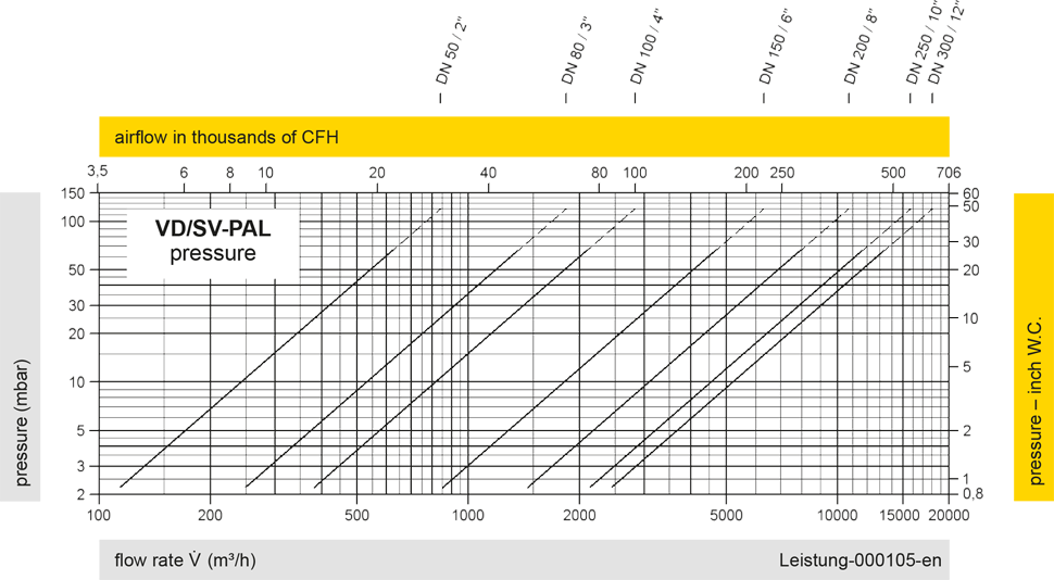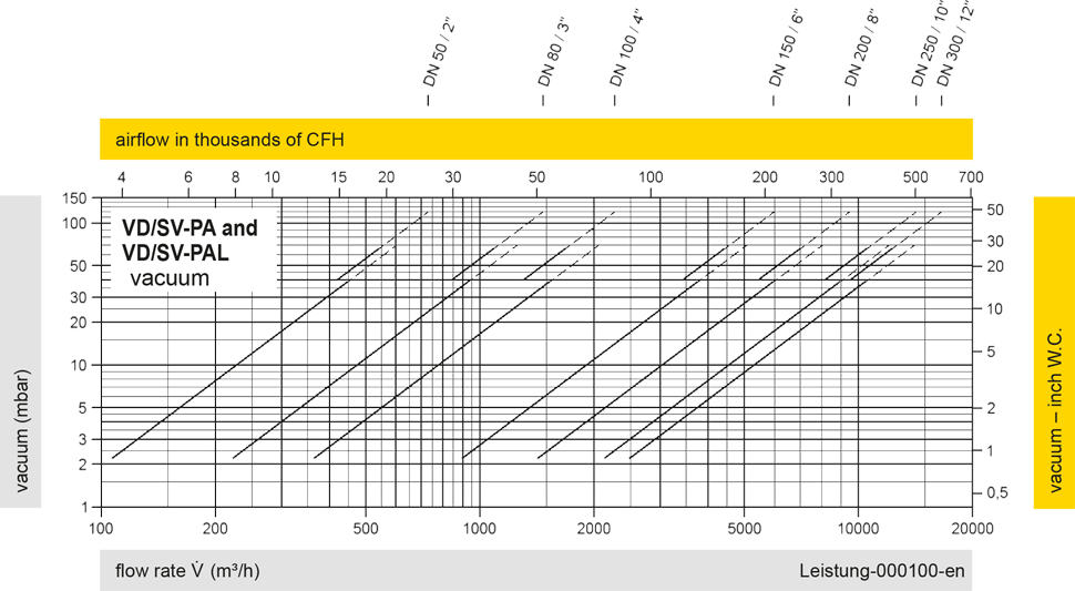 Any combination of vacuum and pressure levels can be set for the valve. When the difference between the pressure and vacuum exceeds 150 mbar / 60.2 inch W.C., special valve pallets are used.