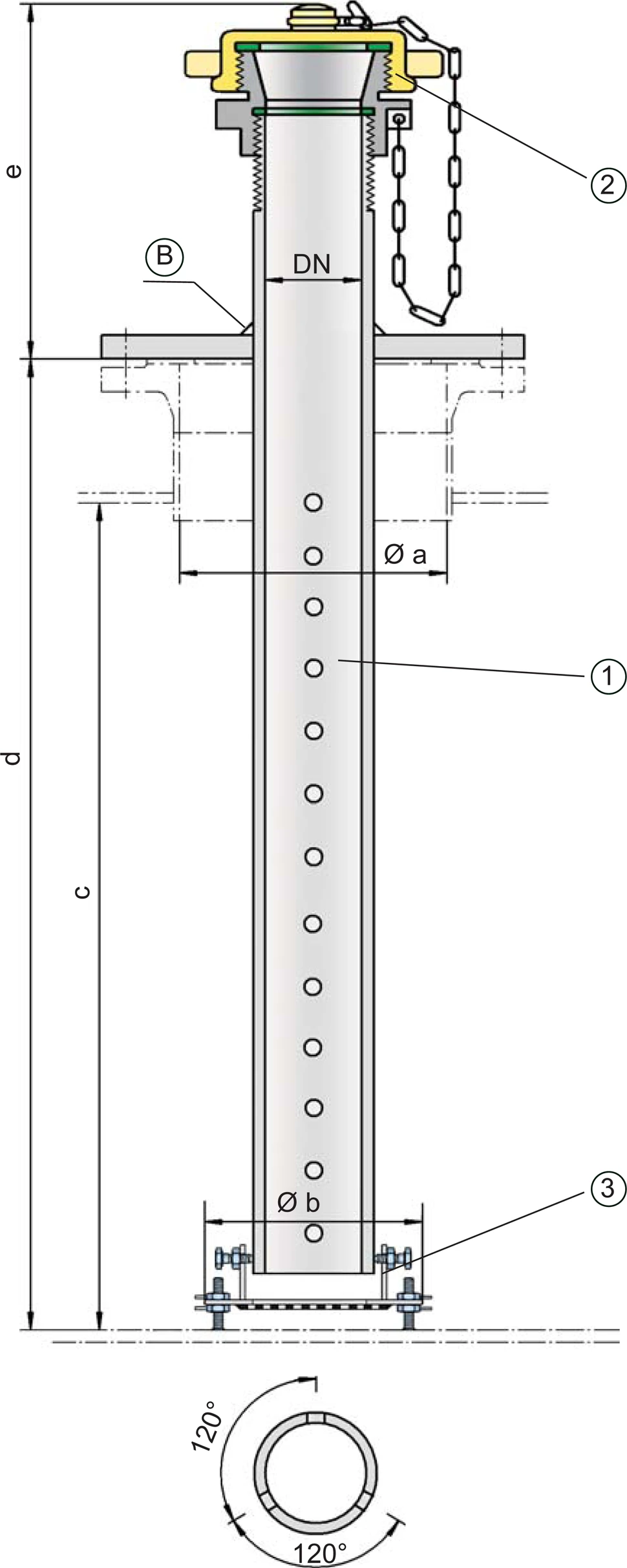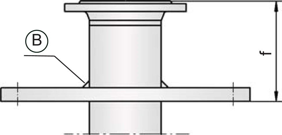 For combination with other gauging device Device A device is a pipe component that influences the media flow by opening, closing, or partially shutting off the flow channel or by dividing or mixing the media flow. design 1 with welding neck flange is available (from DN 100/4''). Instead of the gauging table PROTEGO® PT/S a perforated bottom can be Chosen alternatively.