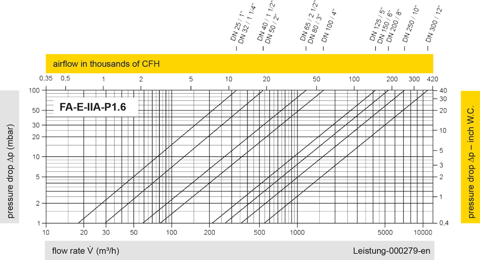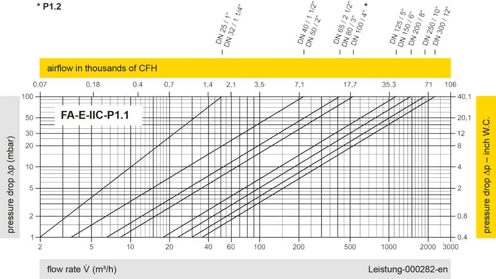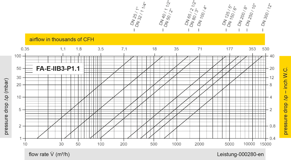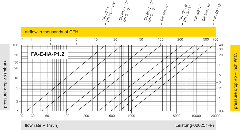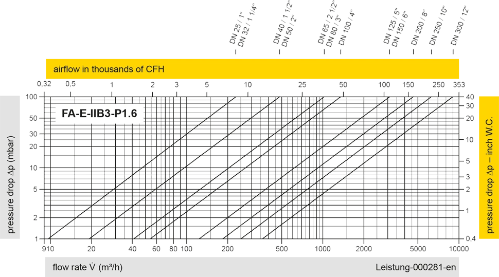 The flow capacity charts have been determined with a calibrated and TÜV certified flow capacity test rig. Volume flow V in (m³/h) and CFH refer to the standard reference conditions of air ISO 6358 (20°C, 1bar). For conversion to other densities and temperatures refer to Sec. 1: “Technical Fundamentals”.