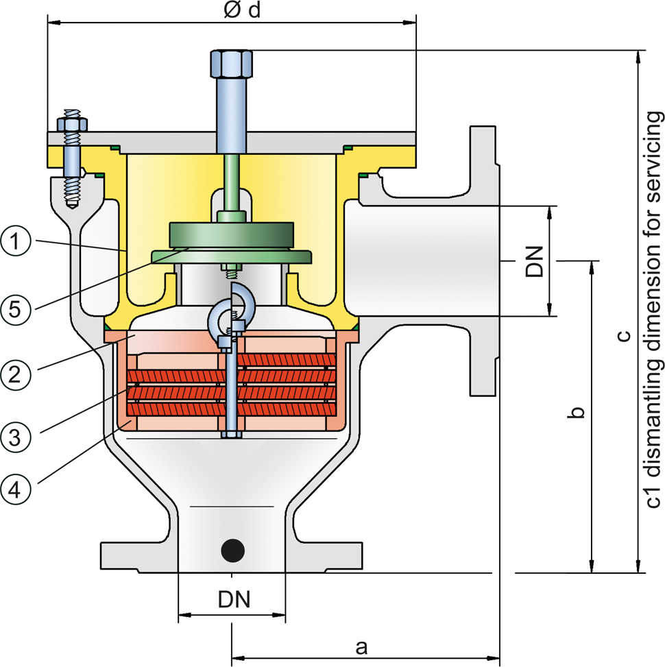 Flame arrester Device fitted to the opening of an enclosure, or to the connecting pipe work of a system of enclosures, and whose intended function is to allow flow but prevent the transmission of a flame. In-Line Detonation Detonation Explosion propagating at supersonic velocity and characterized by a shock wave (EN 1127-1: 1997). Flame Arresterwith integrated pressure relief valve Pressure-relief valve Valve designed to open and relieve excess pressure and to reclose and prevent the further flow of fluid after normal conditions have been restored. , for stable detonations and deflagrations in right angle design with shock absorber Shock absorber A shock absorber is a device that reduces the kinetic energy of a detonation. , unidirectional