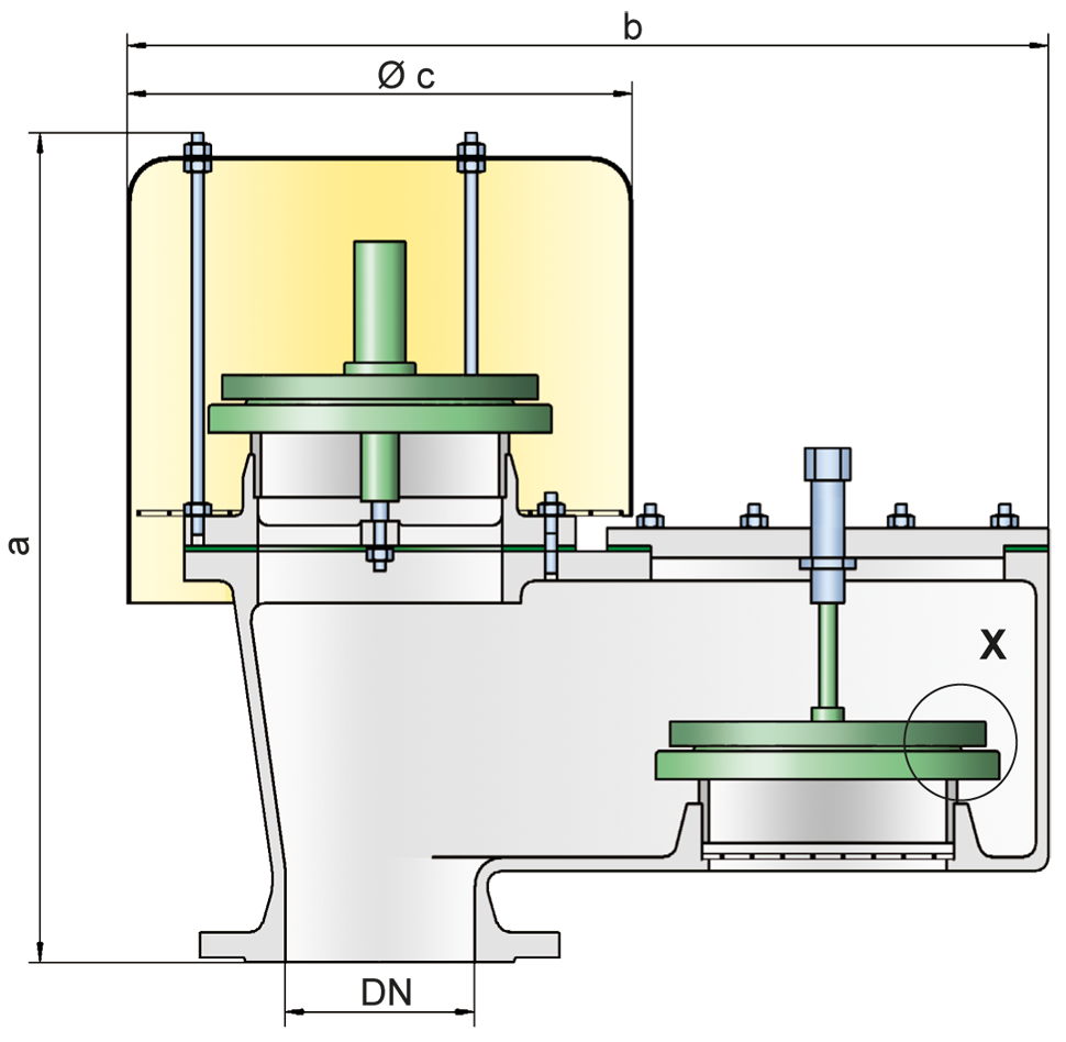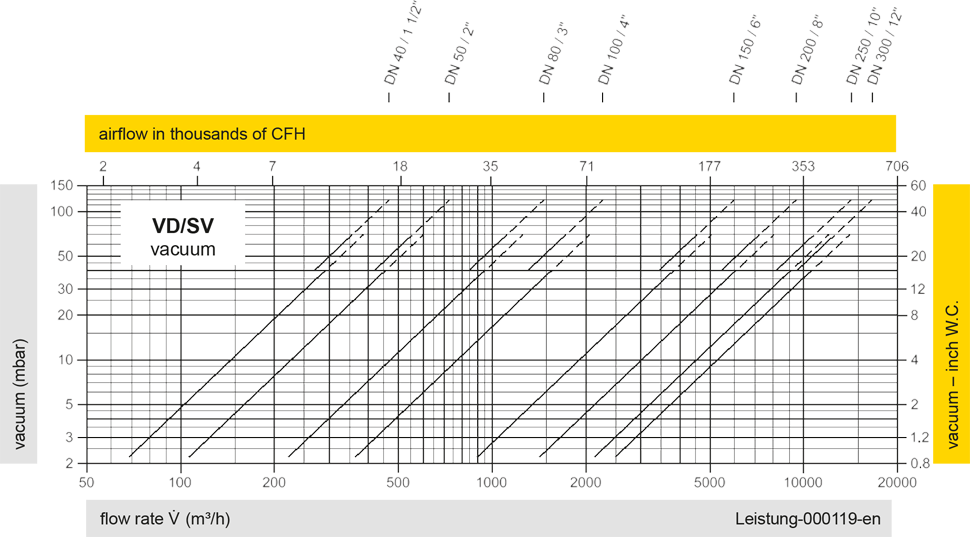 Any combination of vacuum and pressure levels can be set for the valve. When the difference between the pressure and vacuum exceeds 150 mbar / 60.2 inch W.C., special valve pallets are used.