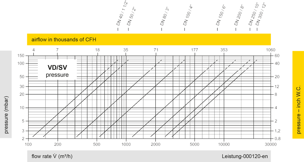 The flow capacity charts have been determined with a calibrated and TÜV certified flow capacity test rig. Volume flow V in (m³/h) and CFH refer to the standard reference conditions of air ISO 6358 (20°C, 1bar). For conversion to other densities and temperatures refer to Sec. 1: “Technical Fundamentals”.