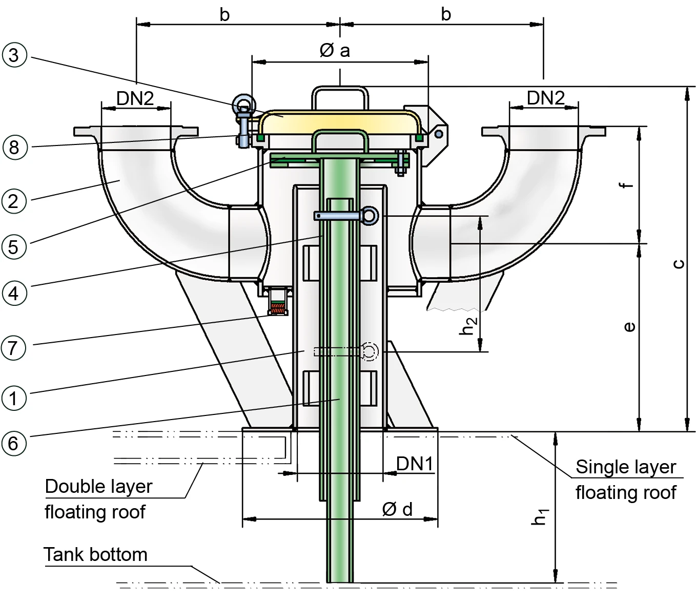 A determinação da quantidade necessária das válvulas de haste e do diâmetro nominal DN ocorre em função da vazão volumétrica calculada (m³/h), da potência da bomba e da potência térmica na posição inferior do teto flutuante e em função da pressão máxima admissível do tanque pT (mbar) de acordo com o diagrama de vazão volumétrica. São possíveis versões especiais.