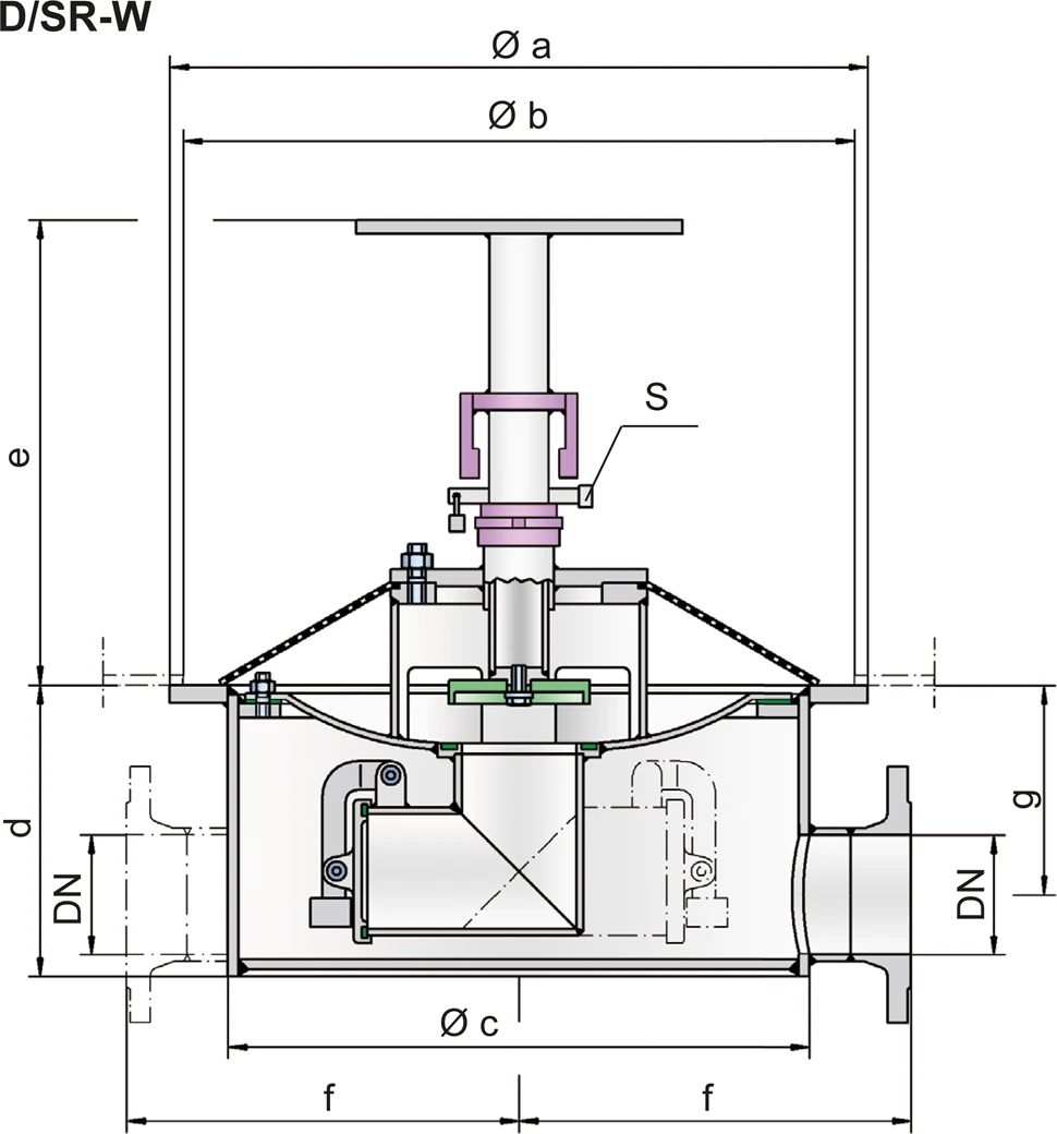 A válvula de teto PROTEGO® D/SR ou tipo D/SR-W tem a função de um recipiente, que escoa a água de chuva acumulada do teto flutuante através dos tubos cisalhantes de um sistema de drenagem de teto flutuante - p.ex. tipo PROTEGO® SE/K ou tipo PROTEGO® SE/CK - à rede de esgotos.