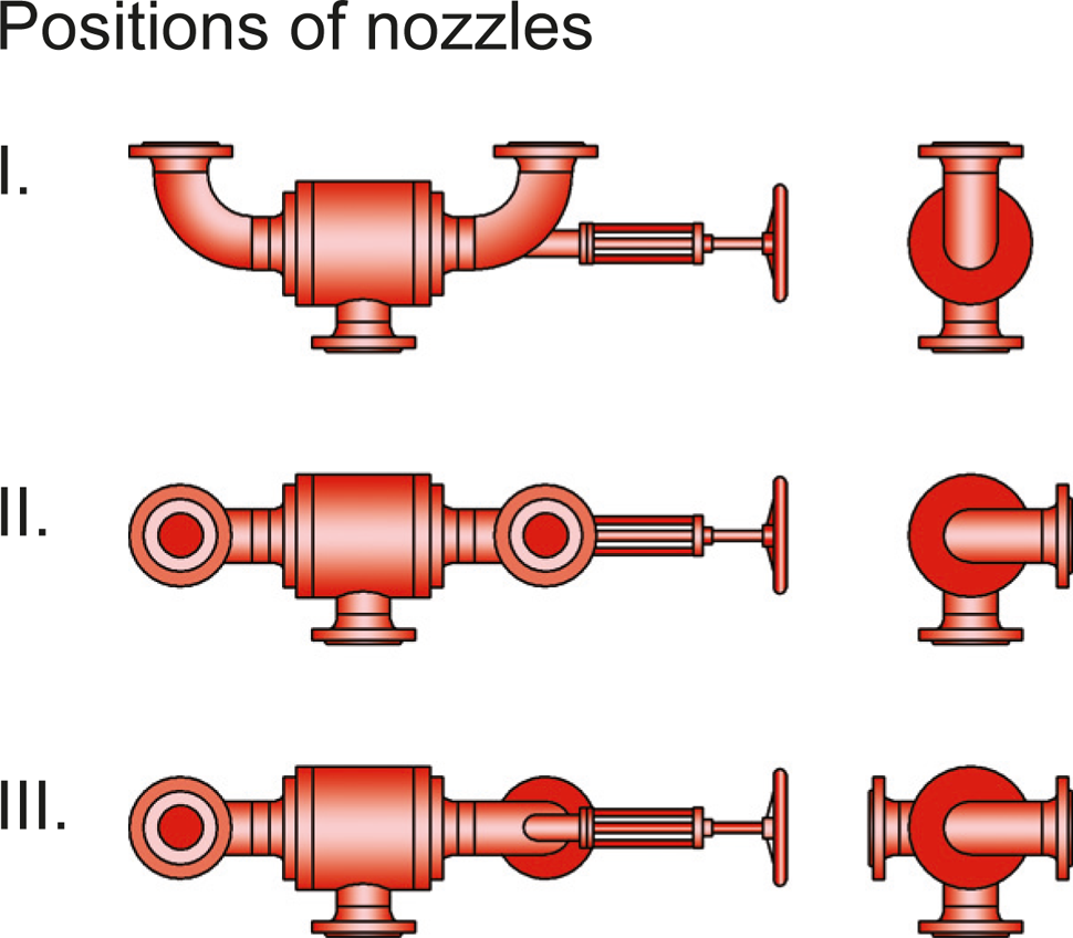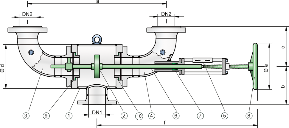 (1) with flange connections DN 1 and two lateral connection elbows (3, 4) with flange connections DN 2 and the valve disc (2). If necessary, it is possible to off-set and turn the connection elbows. The valve seats (9, 10) are replaceable. The valve disc with metallic sealing surface is movable on the valve spindle (6). This ensures good contact pressure with the valve seats (9, 10) even with high temperature differences. The sealing between the valve disc and valve spindle is done by an