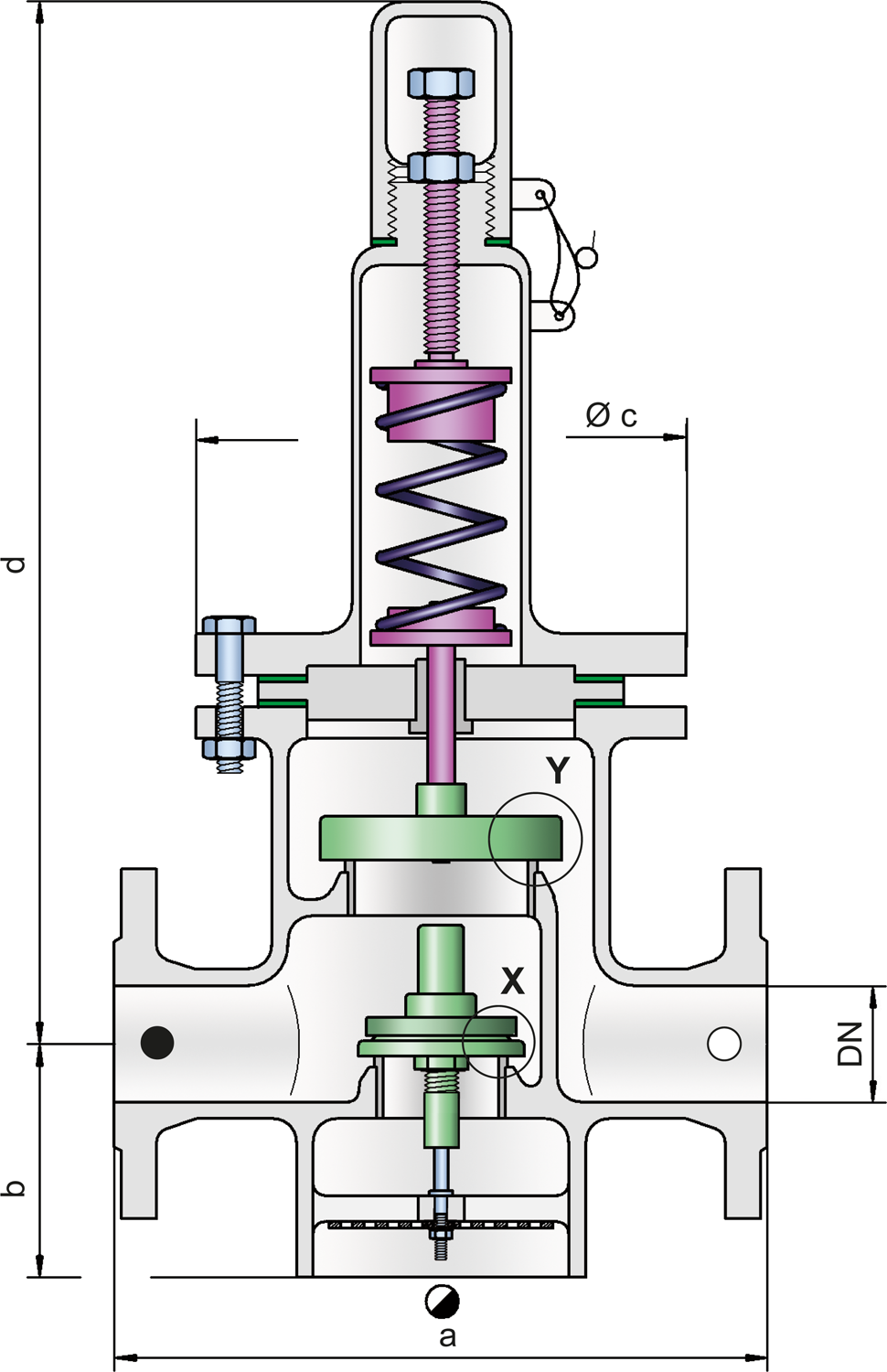 Geralmente deve-se observar a contrapressão nas válvulas de tubulação, que tem influência na pressão de ajuste e no comportamento de abertura. Para casos especiais (p. ex., operação de carga parcial), a válvula também pode ser fornecida com Disco convencional (comportamento proporcional).